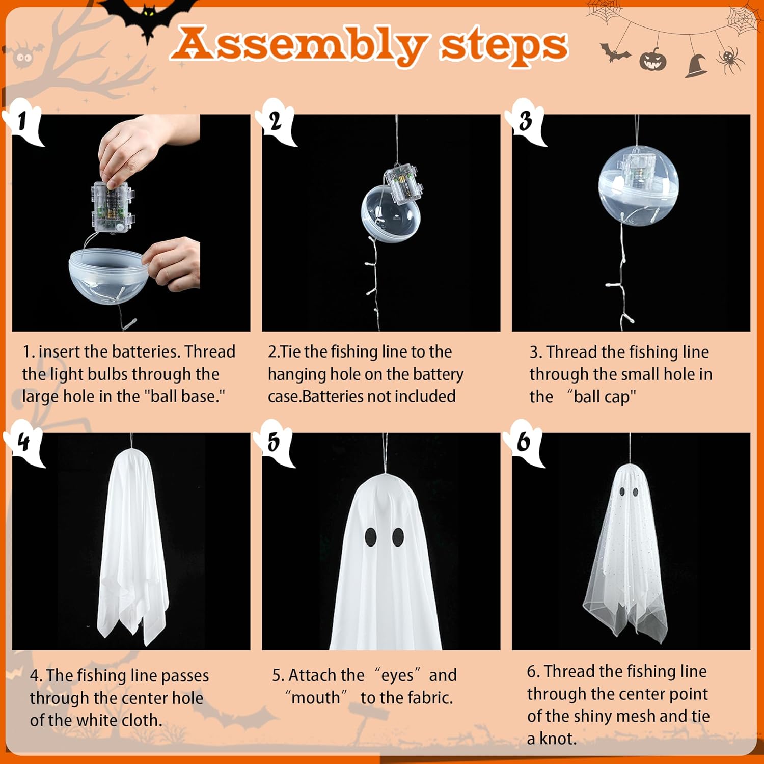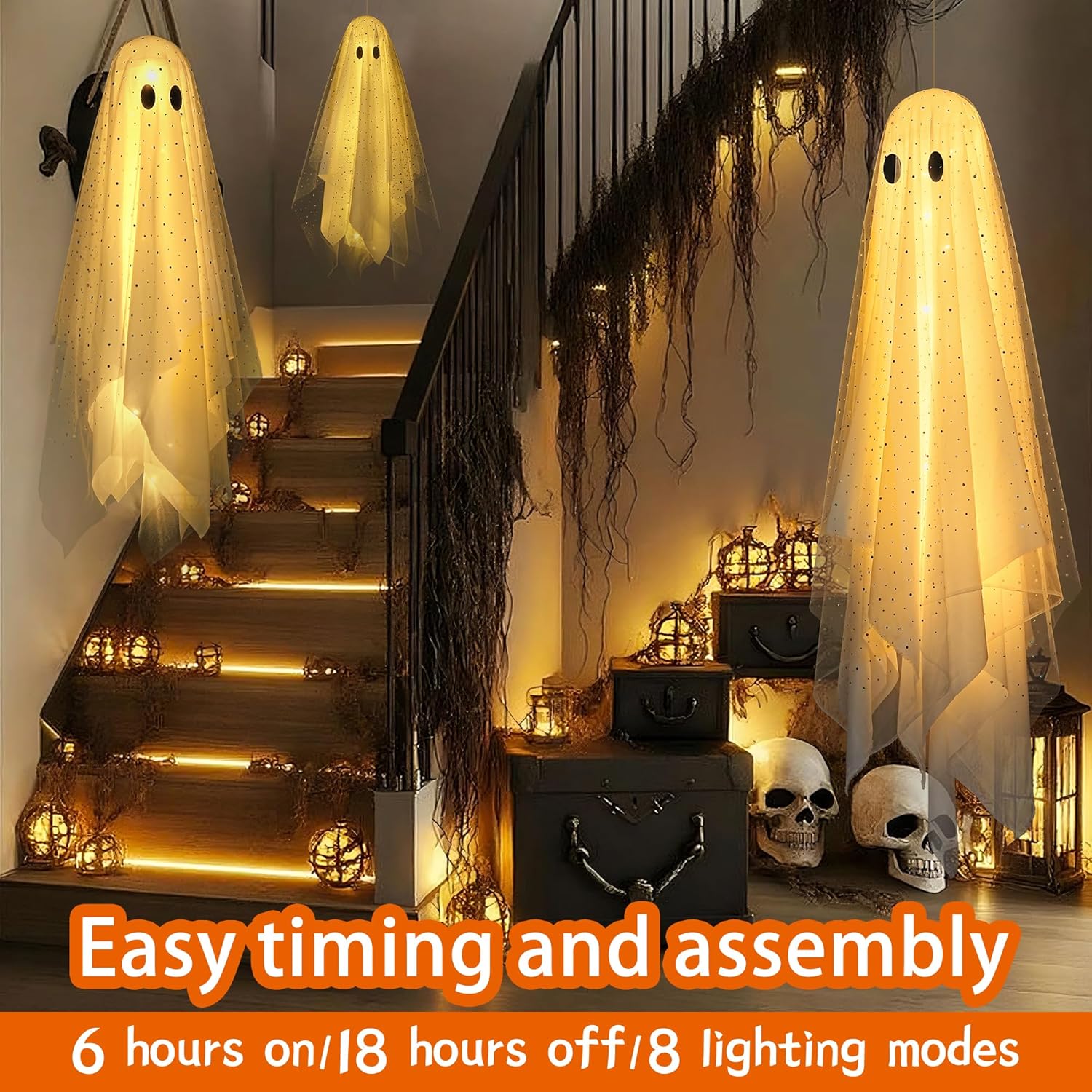 👻Perfect outdoor/indoor decoration: Hang the assembled spooky ghosts on trees, in courtyards, on porches, or indoors on ceilings, windows, and more. This will be the highlight of the party, adding a mysterious and spooky atmosphere to your event, leaving every guest in awe.