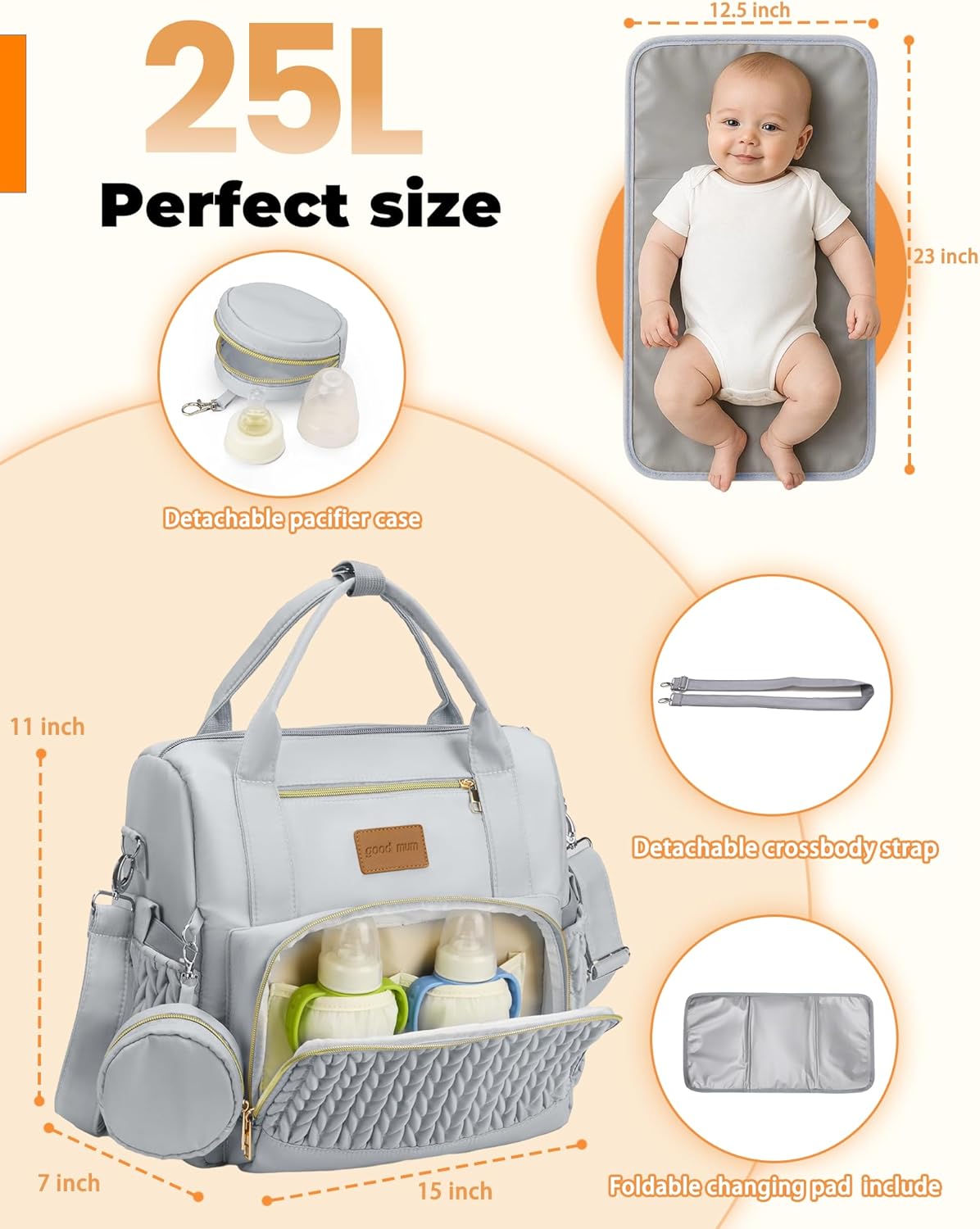 【Large Capacity Diaper Bags for Baby】 This diaper bag backpack fits all your baby essentials: 8+ diapers, 2 bottles, wipes, clothes, and mom’s phone/wallet. Baby bag size: 15″L x 7″W x 14″H,Changing pad: 23” x 12.5”,This baby nappy bag holds everything you need for on the go parenting—no more frantic searching, everything has its place.