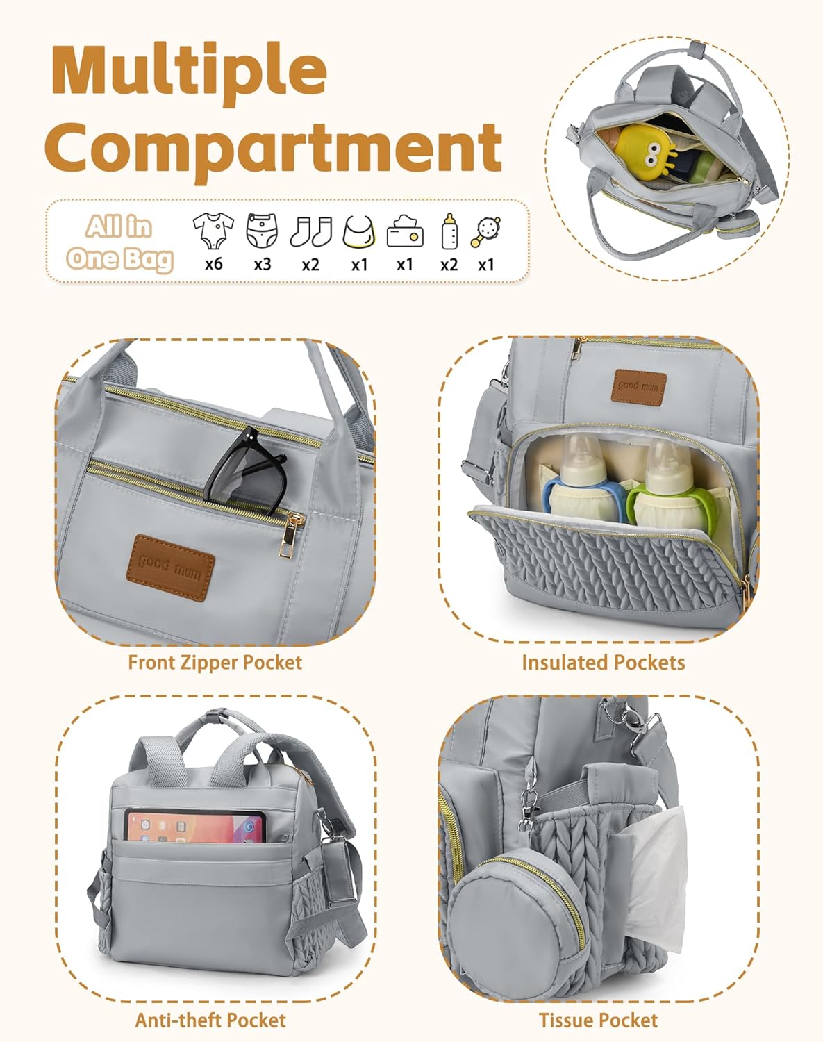 【3 Compartments & 16 Functional Pockets】Thoughtfully designed with a wide, easy-access opening so you can grab what you need in seconds, features a secure anti-theft back pocket for valuables such as IPAD , insulated bottle holders, waterproof pockets , and convenient side tissue pockets. Everything stays neatly organized, so you can focus on what truly matters—your baby.