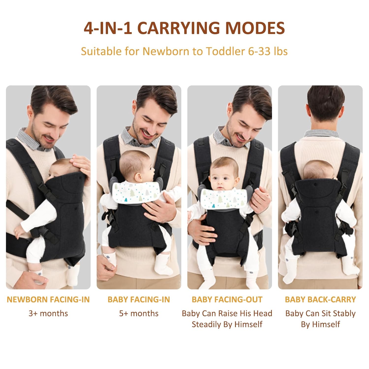 Baby Carrier, Hands Free Adjustable Ergonomic Baby Carrier Newborn to Toddler 6-33lbs, 4-in-1 Baby Sling Wrap with Saliva Towel, Front Back Carry, Baby Essentials Gift (Black)