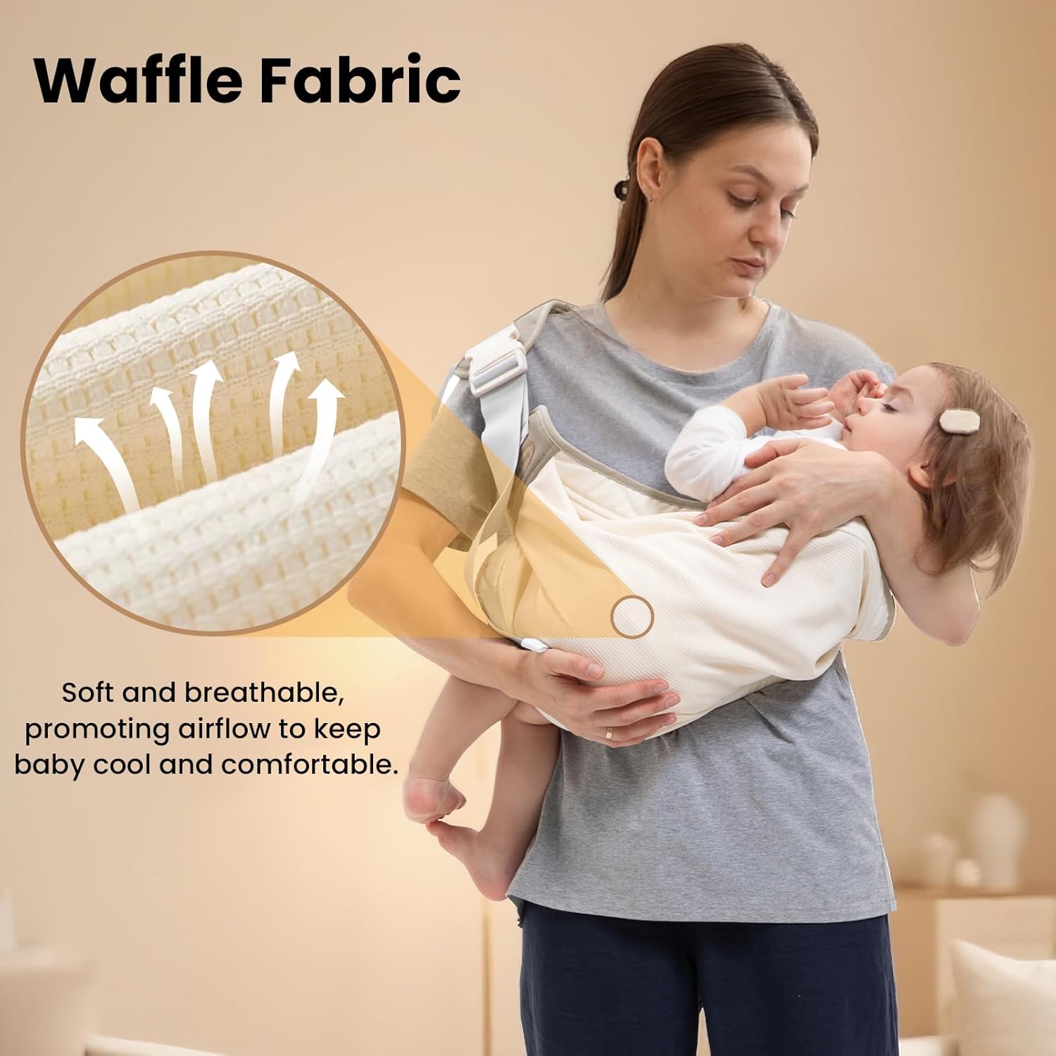 【Designed for Comfort & Safety】Reinforced buckles and soft padded edges ensure secure support without pinching or chafing. The baby sling carrier’s waffle-knit lining provides cloud-like comfort against your baby’s skin, perfect for all-day wear during walks or travel.