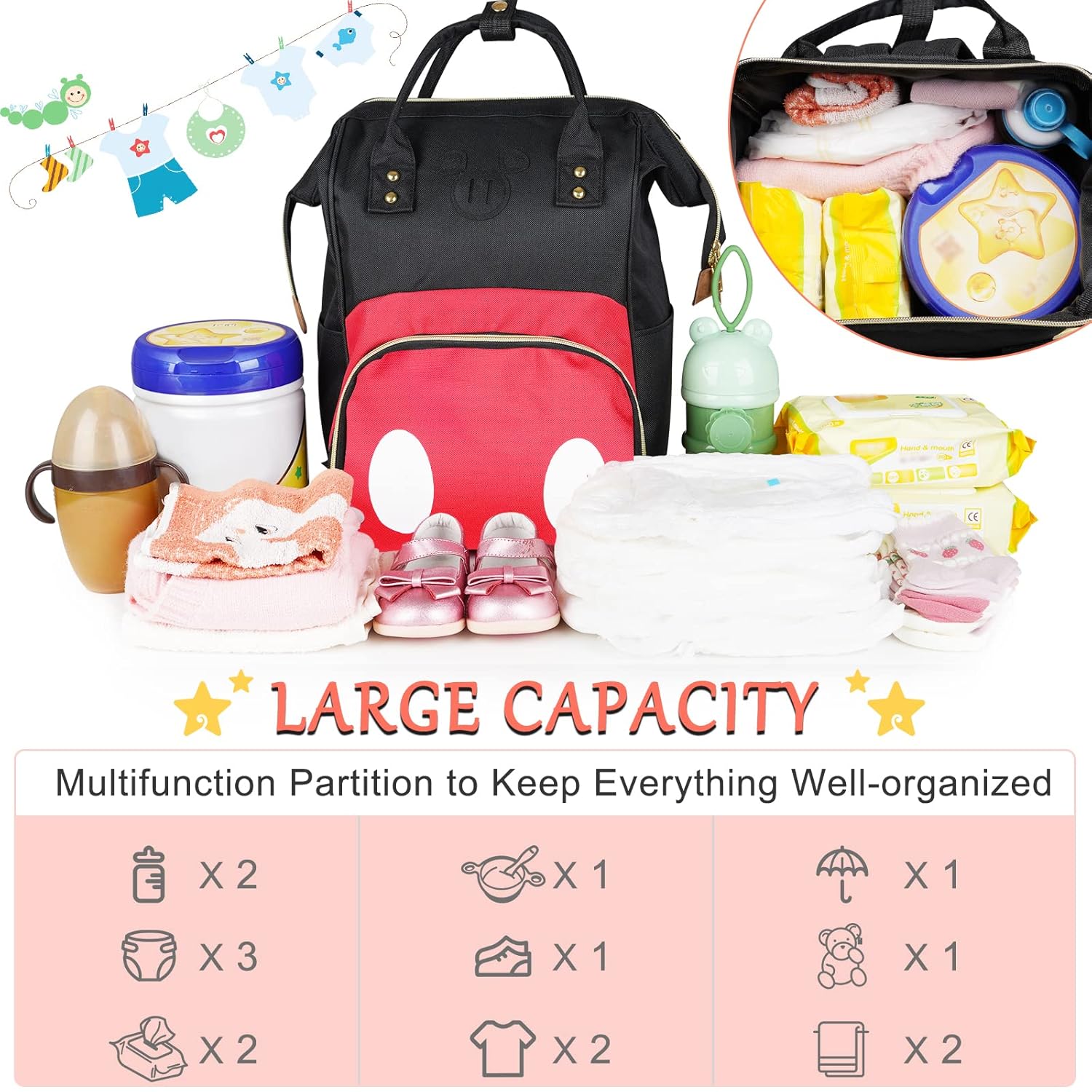 FASHION DESIGN:Diaper bag has a button that can hang the bag conveniently on a stroller, freeing up both of your hands. This diaper backpack has cute cartoon design with red polka dots and beautiful linesand suitable for any occasion like shopping, traveling etc,suitable for mom, womens, girls,men all while.