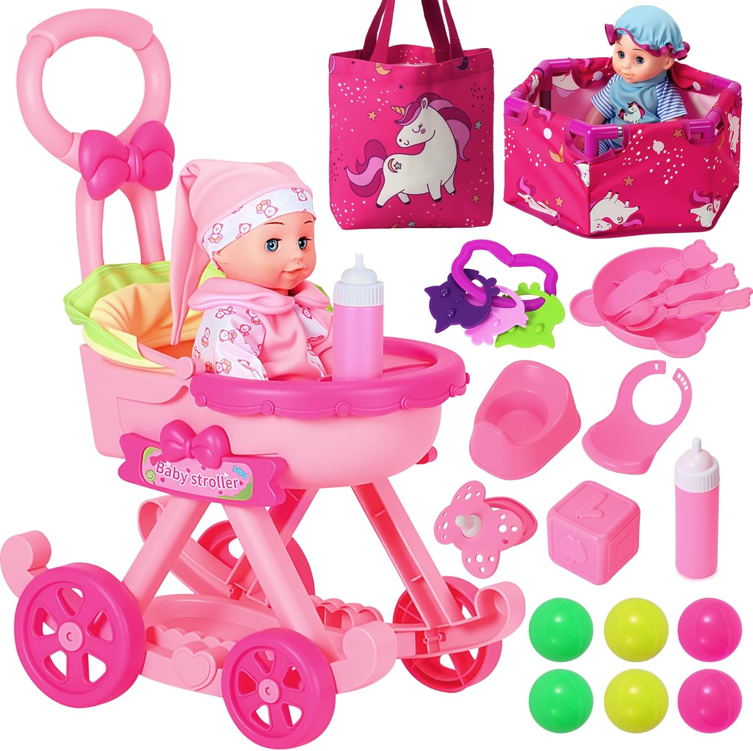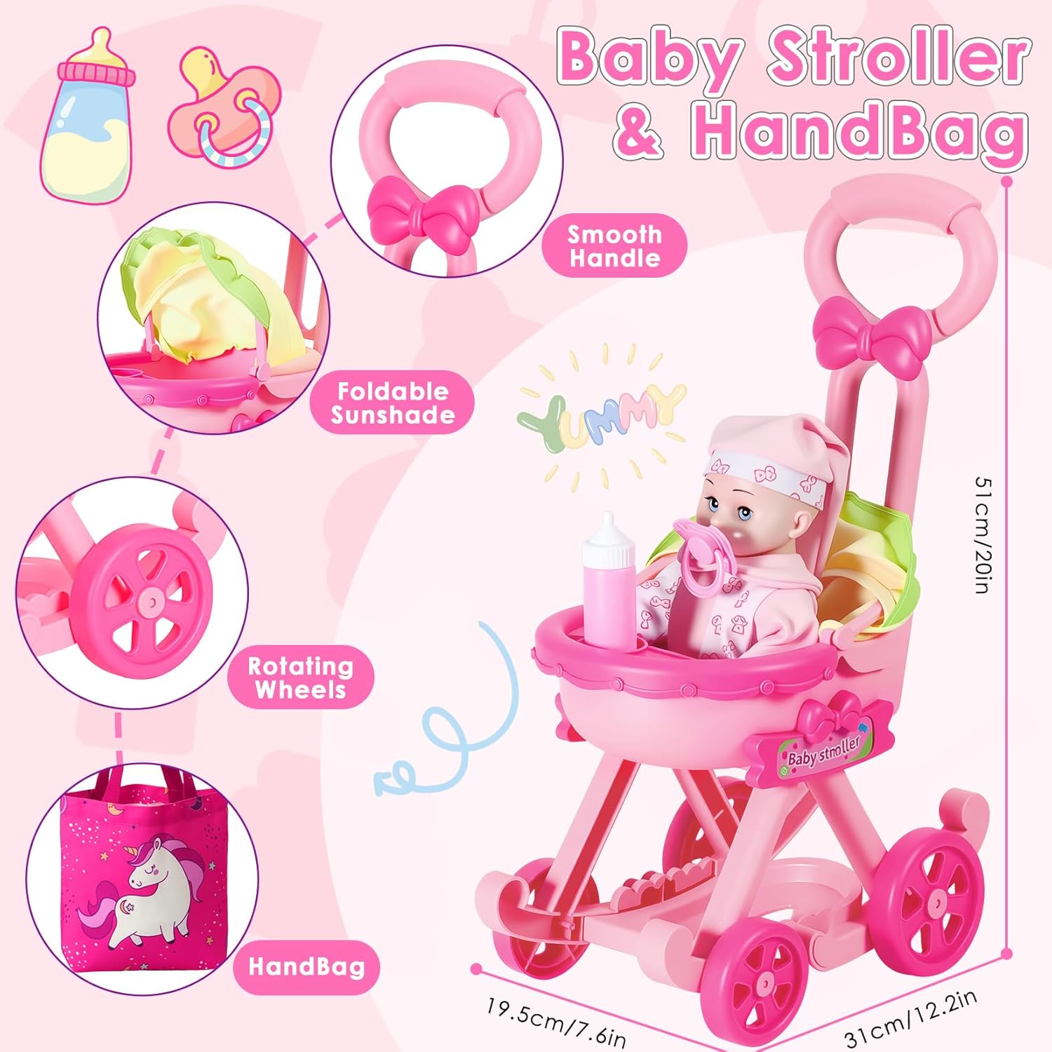 【Educational and Fun for Pretend Play】 Ignite Imagination, Grow Essential Skills! Your children can practice dressing their doll, feeding it with utensils, and playing games with it.Baby doll stroller set role-playing helps children develop a sense of responsibility, and awareness of daily tasks,fostering creativity and building communication skills in a playful, interactive way.
