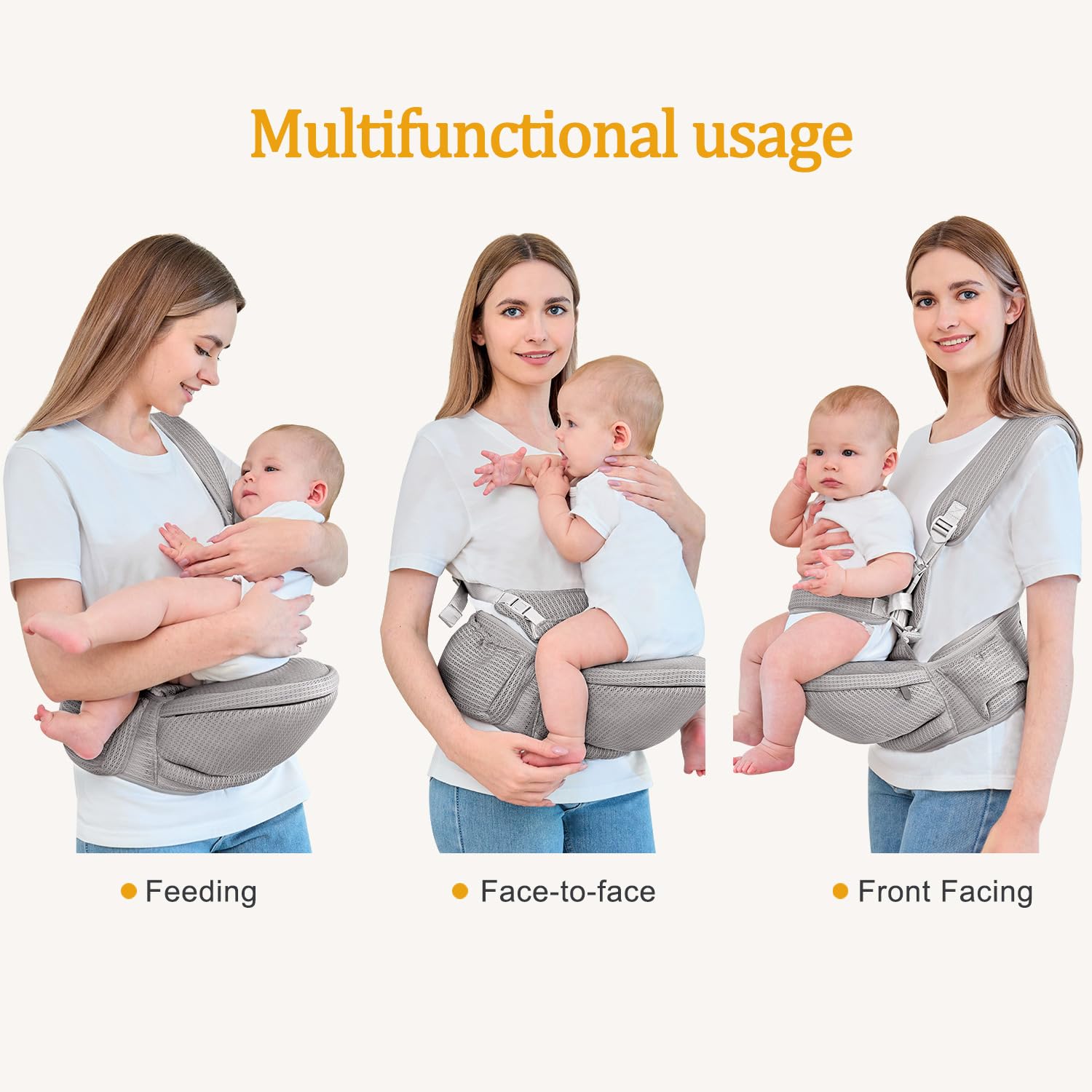 【Versatile multiple-in-1 Design】 This hip carrier for baby supports:carrier;carrier&baby safety belt;carrier&single shoulder strap;carrier&single shoulder strap&baby safety belt to adapt to your baby’s growth and your needs from newborn to toddler