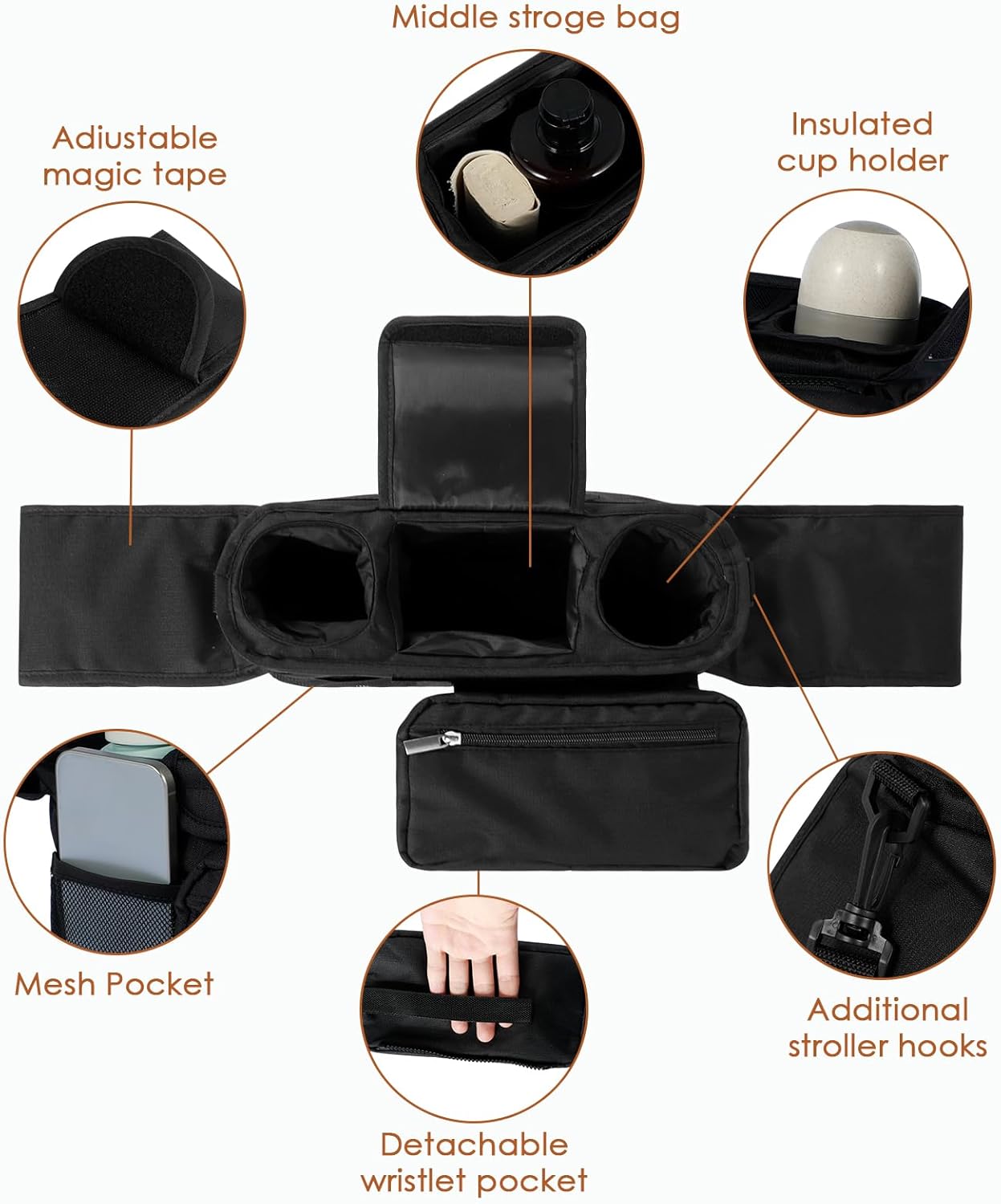 [2 Cup Holder] This baby stroller organizer is designed with 2 insulated cup holder that is universal for most cups and milk bottles, keeping bottles at the ideal temperature. Perfect for feeding your baby at the optimum temperature, even during the travel.