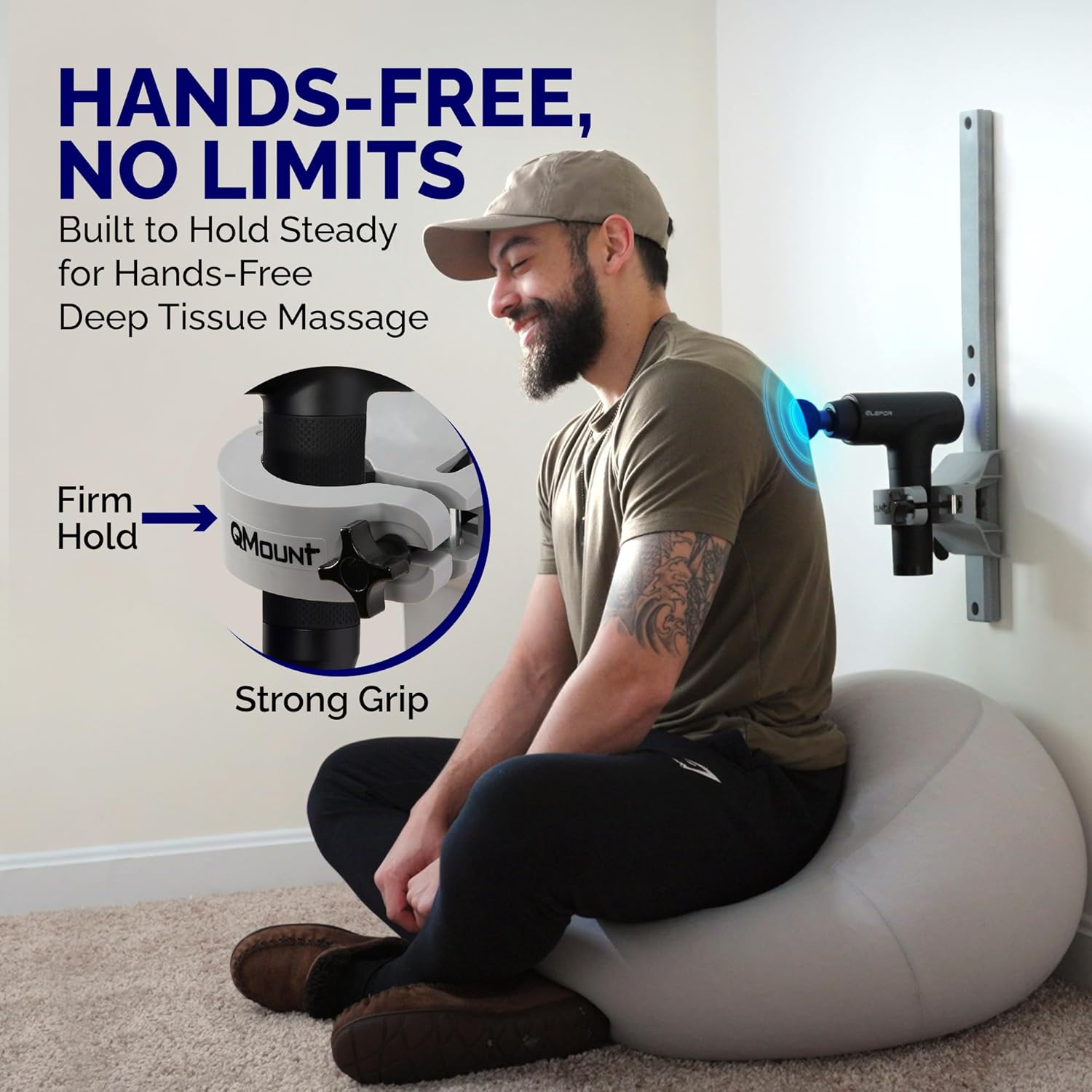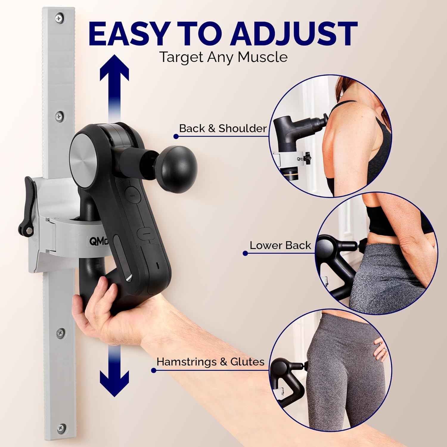 Sometimes the most difficult areas are those that need the most attention. The QMount back massage gun holder is designed to solve exactly this problem. Designed for comfort and durability, it gives you full control of your massage gun – no extra hands or awkward angles required. Made from high-strength nylon and anchored by a sturdy 12″ wall rail, QMount provides a stable and reliable platform for consistent use. Mount it directly to any standard wall stud with the included screws and installation instructions. and instantly create a special vertical station in your home studio, garage or gym. Once attached, it stays in place – ready whenever you are. What distinguishes it is its adjustable design. The handle holder glides smoothly up and down the rail and locks securely in place with a cam lever. Whether you need to target upper, middle or lower back areas, the QMount adjusts to your standing height and positioning with fast, one-handed adjustments. Its universal handle accommodates a variety of massage gun grips, holds your device securely, allowing you to apply even pressure without having to hold it yourself. Designed to support multiple handle sizes and shapes, it provides a snug fit and firm grip during use. From warm-up exercises to cooling down or after training, QMount brings ease and control to your routine. It is designed for those who take their training and mobility seriously and prefer smart tools that fit seamlessly into their daily setup. With its streamlined profile, non-slip feature, and straightforward setup, QMount brings hands-free comfort to a traditionally practical task. Whether you’re setting up for the first time or refining your existing space, it’s an easy way to take more control – literally
