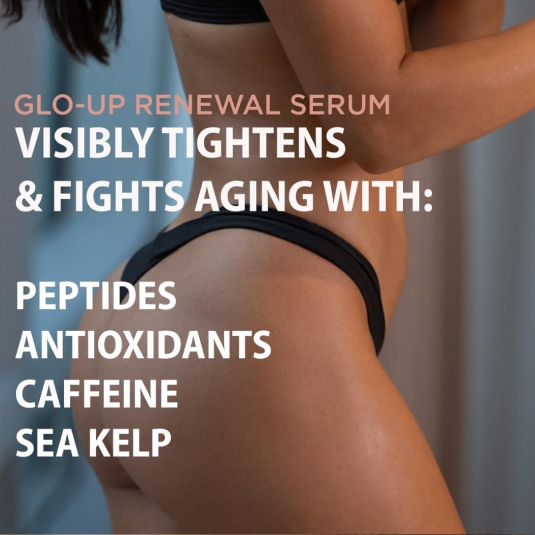 GLO-UP Renewal Serum is an anti-aging body serum designed to illuminate and firm your skin from head to toe. Infused with a potent blend of peptides, caffeine, and antioxidants, this serum works to smooth and tighten the appearance of your skin. It also effectively treats sun damage and rejuvenates your skin, leaving it looking visibly more youthful and radiant.