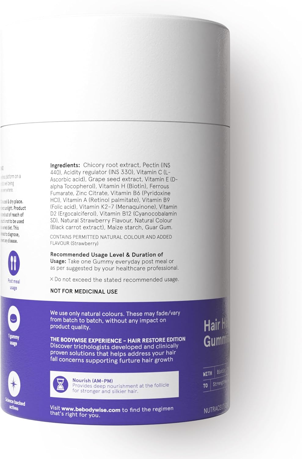 All hair growth vitamins that your hair needs – like Biotin, Zinc, Fibre and Multivitamins (Vitamin A, E, B6, B9, B12, D2) packed in a yummy chewable form, for hair growth & hair loss control. Suited for all hair types!