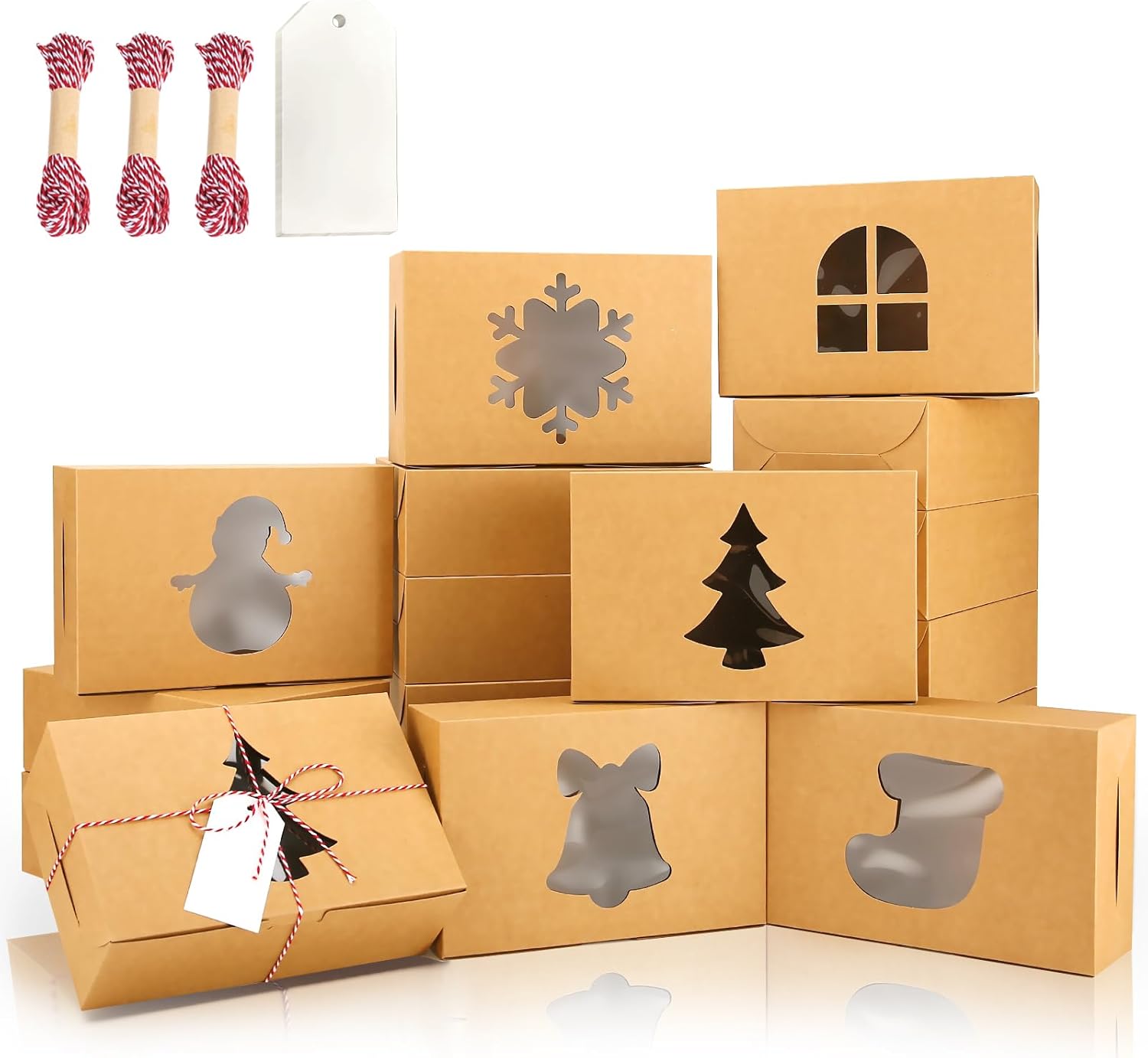 Package Includes: There are 36 pieces cookie boxes with 6 style transparent windows ( including snowman, christmas tree, snowflakes, bell, christmas stocking and window). 4Pcs/each style.The Bakery Boxes comes with 36 pcs free tags and 5 pcs Red and white twine(164 ft), You can dress the box up as a fancy gift box with tags and red and white twine . Share it with your friends and family and feel your love