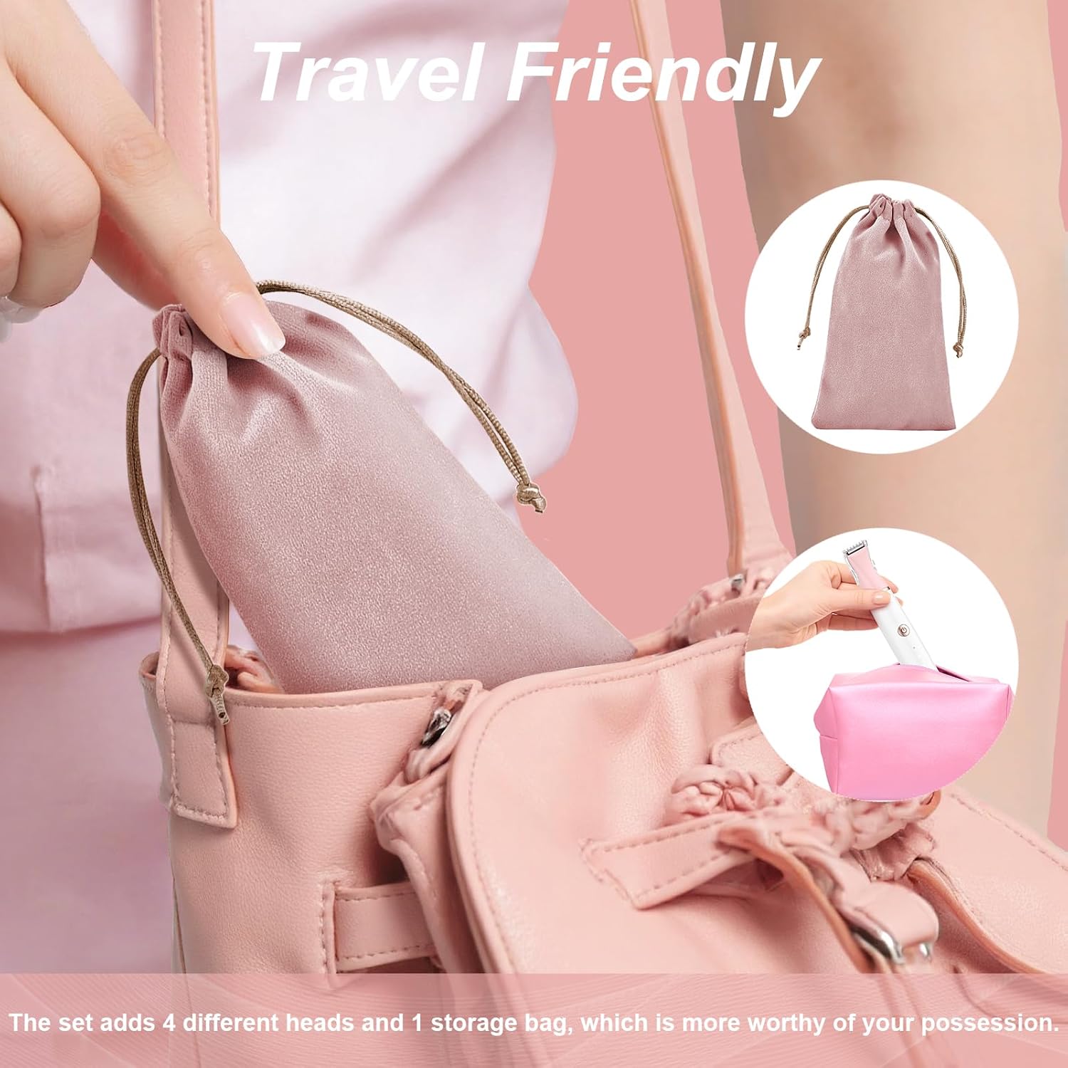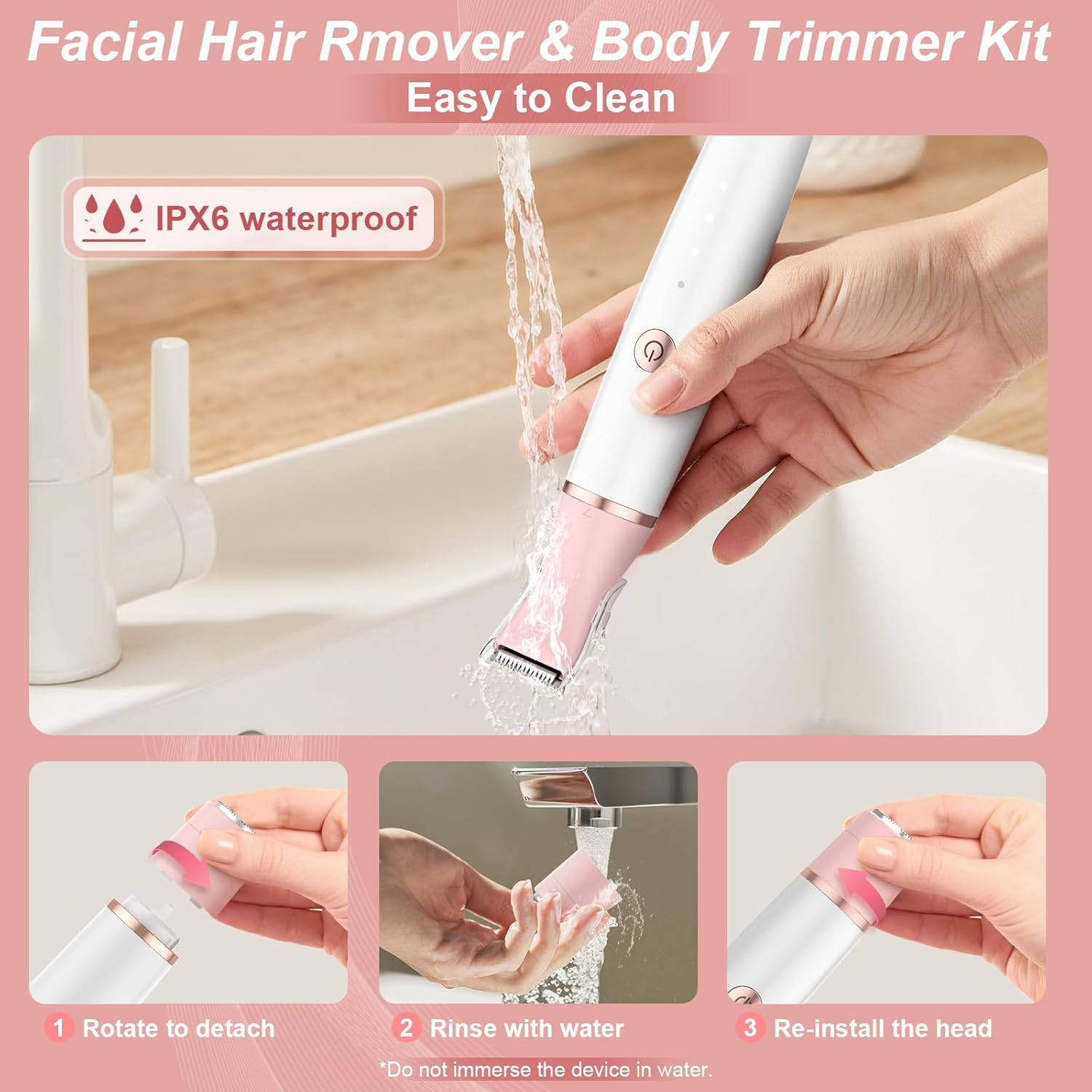 4-in-1 Bikini Trimmer Women for All Needs: This versatile women’s electric shaver comes with four interchangeable heads: a bikini trimmer for sensitive areas, a facial hair remover for peach fuzz and lip hair, an eyebrow trimmer for precise shaping, and a nose/ear hair trimmer. One hair removal device to cover all your grooming needs, making you confident and ready for any occasion.