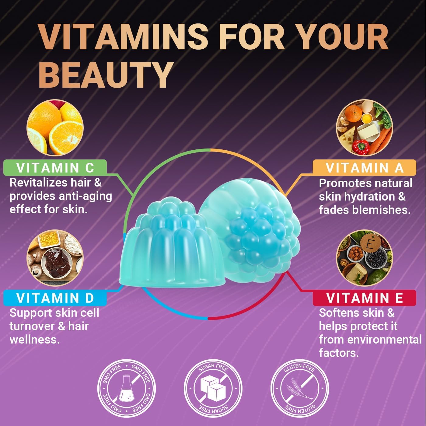 Complete Beauty Vitamins + B Complex – Unlike basic biotin collagen gummies, our biotin for hair growth gummies contain essential vitamins A, C, D, E, and B-complex ( vitamins B1,B2,B3, B5, B6, B7, B9, B12), to help promote silky hair, radiant skin, and strong nails.