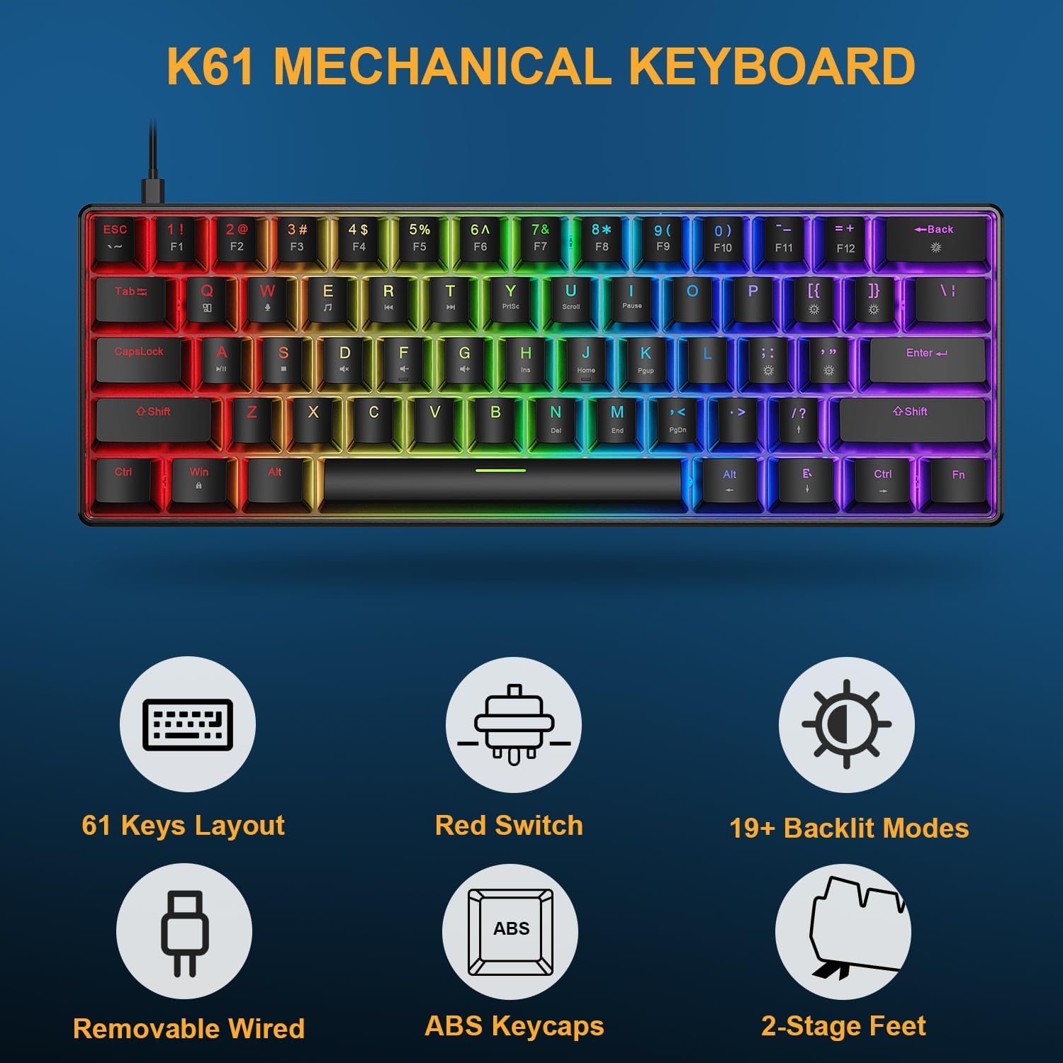 【Compact 60% Gaming Keyboard 】This compact 61 key mechanical keyboard removes the number pad and function row, offering a minimalist layout perfect for gamers and creators. Its space-saving design frees up desk space for better mouse movement and reduces visual distractions. The detachable Type-C cable ensures easy portability for gaming or work on the go, making it the perfect travel companion.