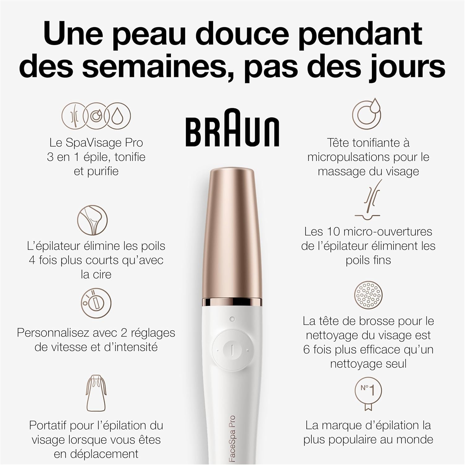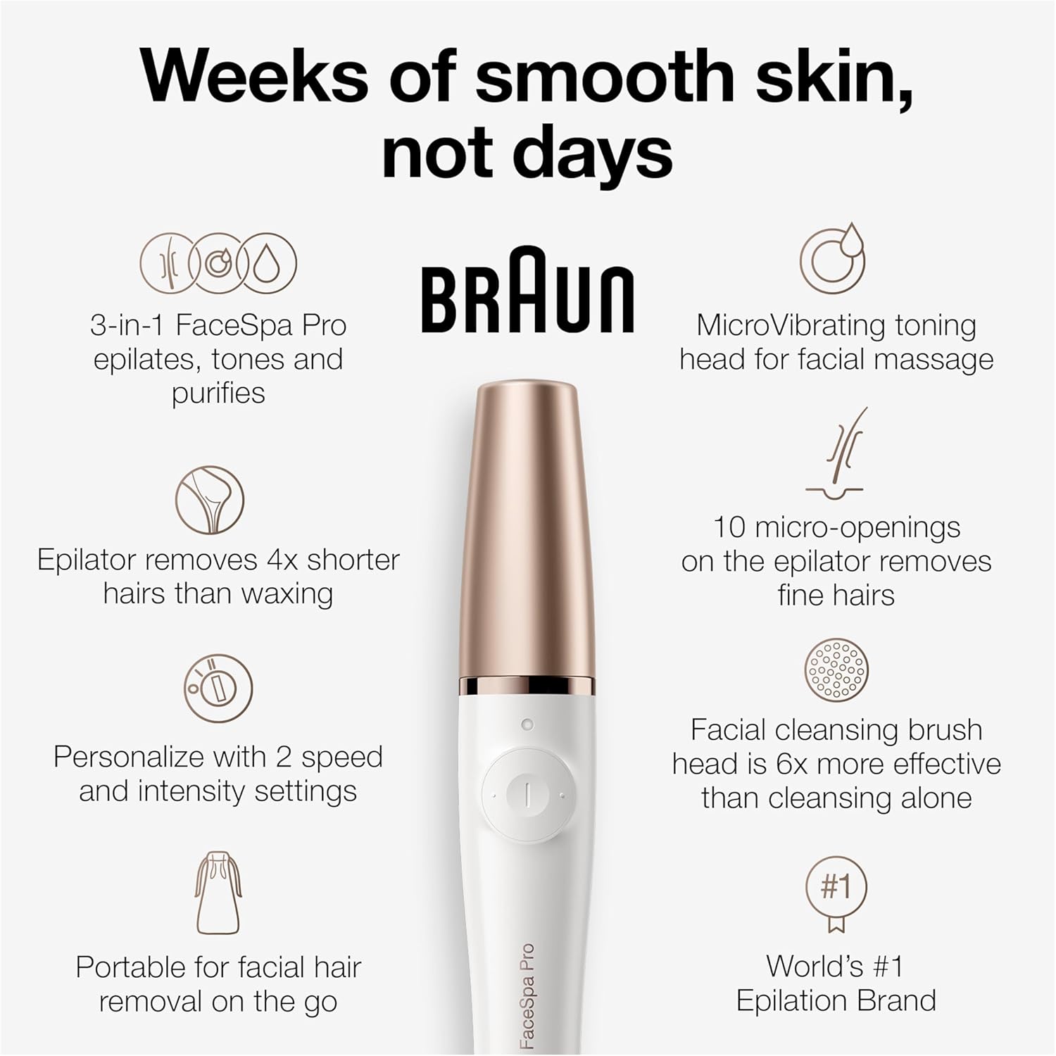 The Braun FaceSpa pro is the world’s 1st 3-in-1 facial epilation, cleansing and skin toning device. Gently remove facial hair by the root with the epilator attachment for long-lasting smooth skin. The facial cleansing brush removes make-up while the MicroVibration head works with your serum or cream for skin-toning effects. Better application of your skin care product vs manual.