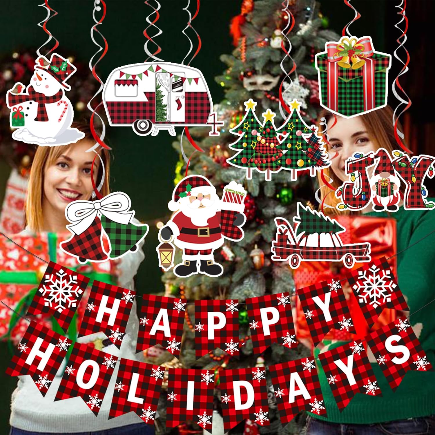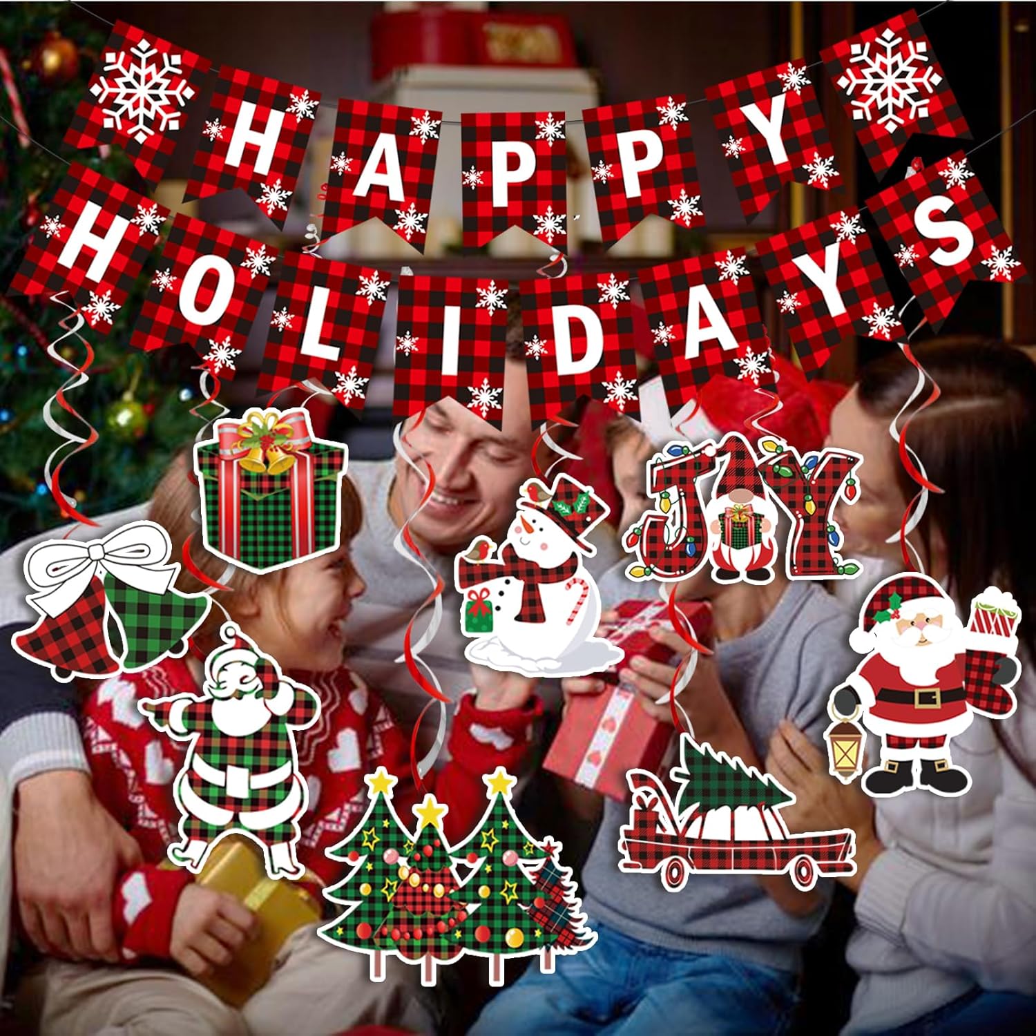 Package include: 1*”Happy Holidays” buffalo plaid banner, 15*buffalo plaid Friendsmas hanging swirls decorations, with 15 designed cardboard, 7*sliver 8*red swirls.