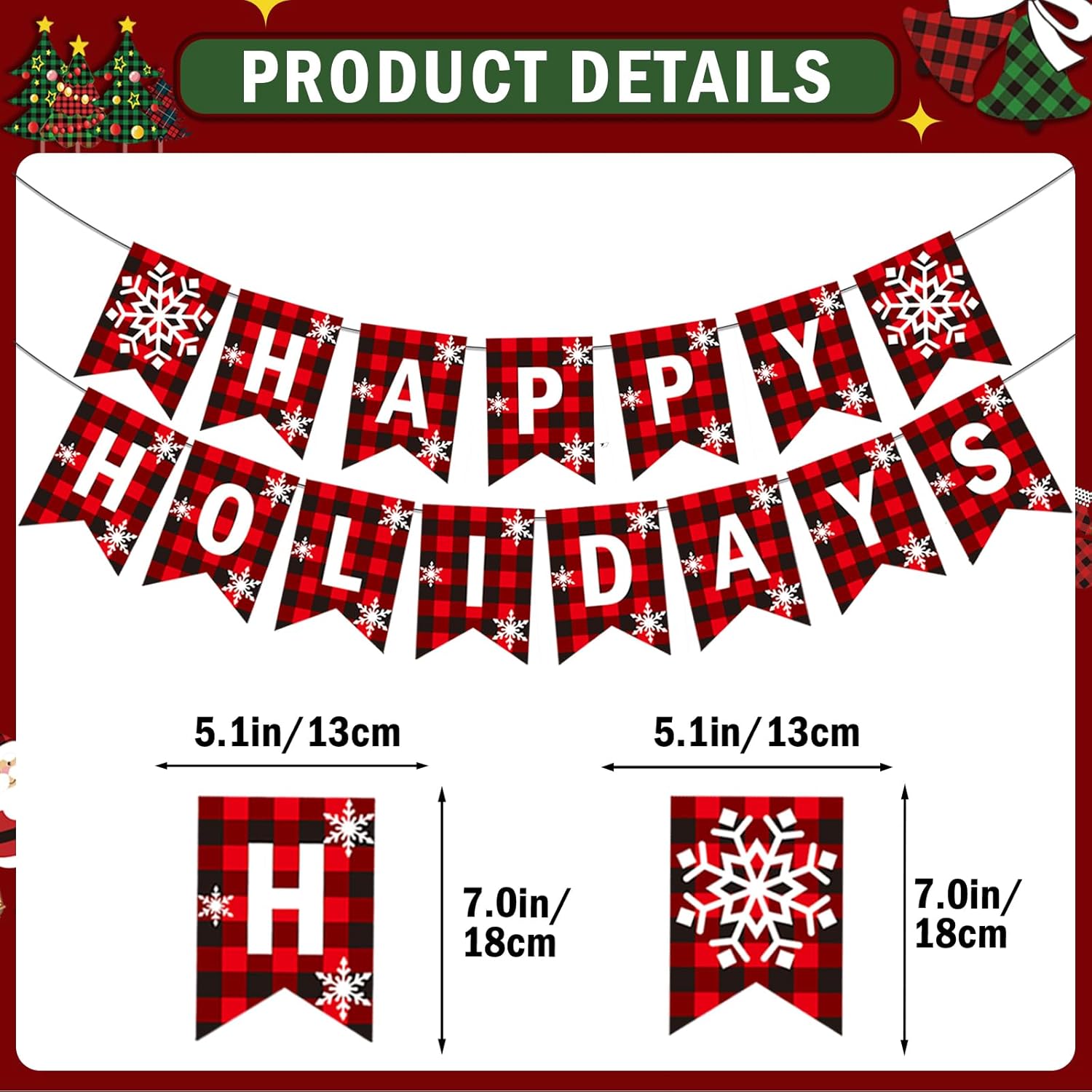 Package include: 1*”Happy Holidays” buffalo plaid banner, 15*buffalo plaid Friendsmas hanging swirls decorations, with 15 designed cardboard, 7*sliver 8*red swirls.