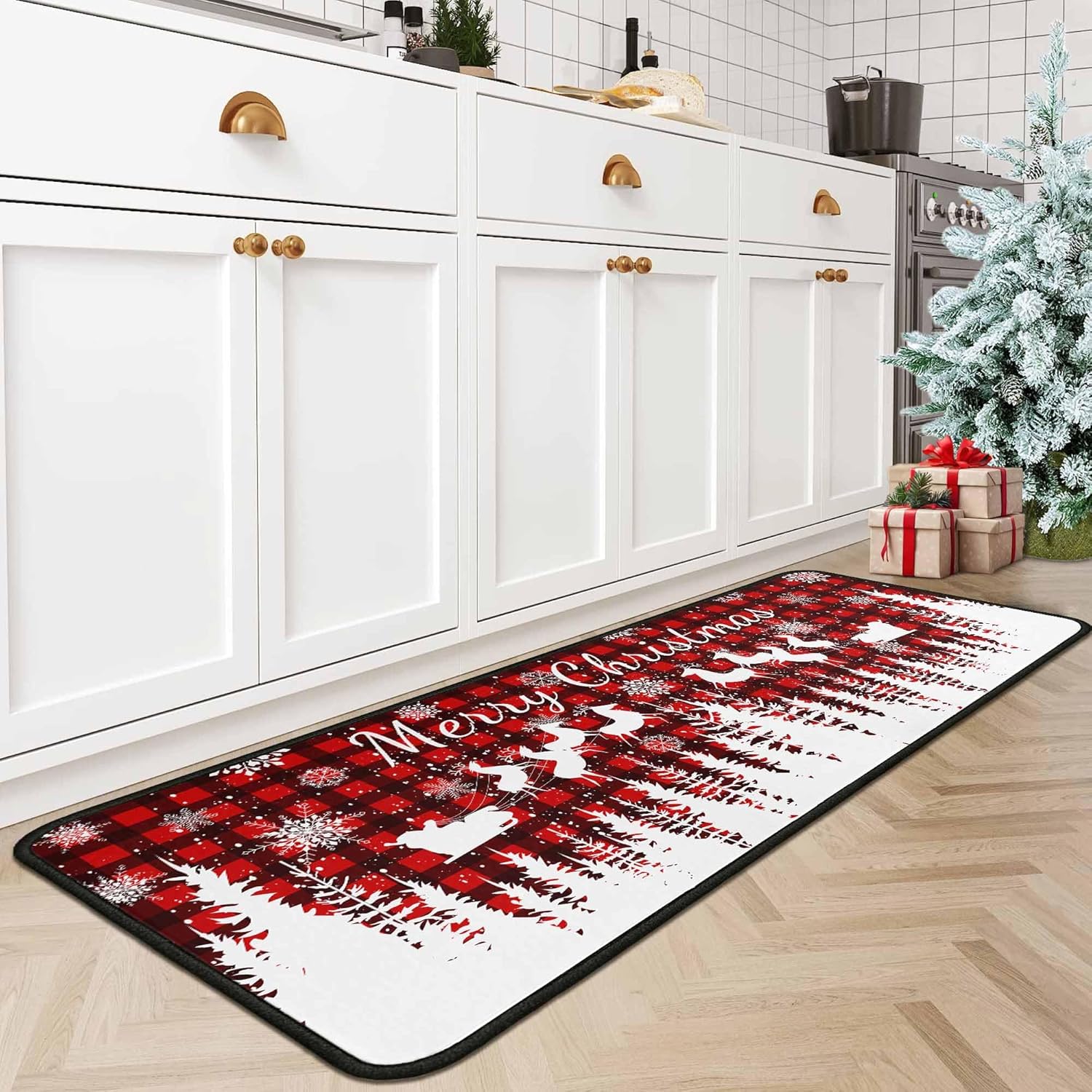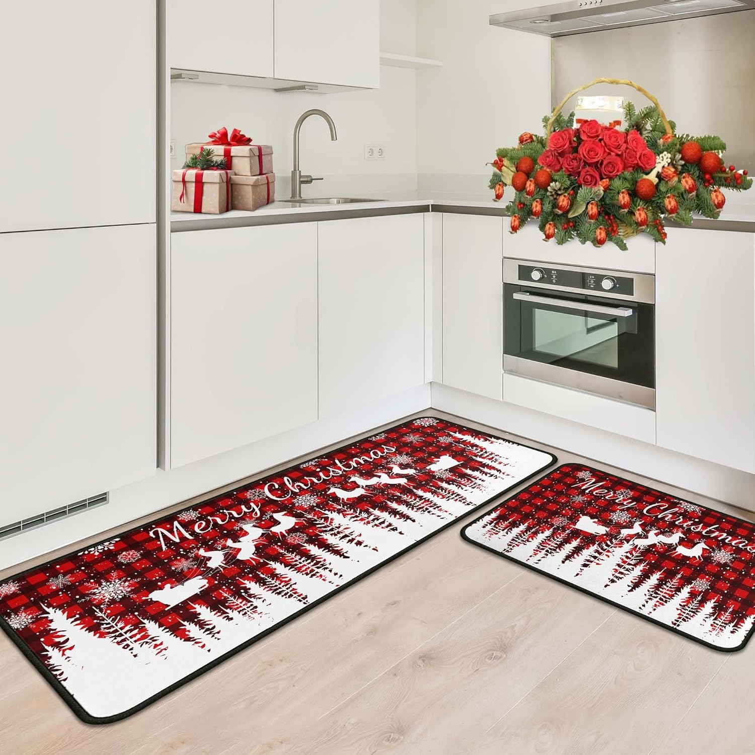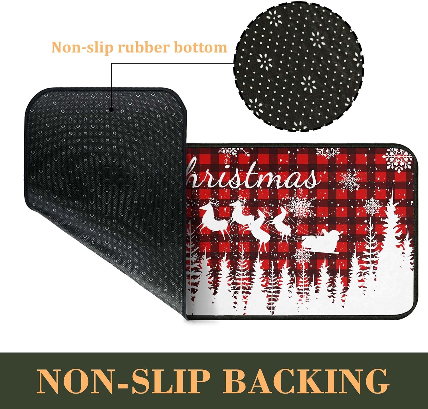 Perfect Size – You will receive christmas style 17″x47″+17″x30″ 2 pieces kitchen mat .Our kitchen rugs are featured with low-profile design. With this thin rugs fit under door forget about curling or getting stuck . Non slip backing holds the kitchen mats set in place for extra safety. No more worries about slipping or scratching the floor.