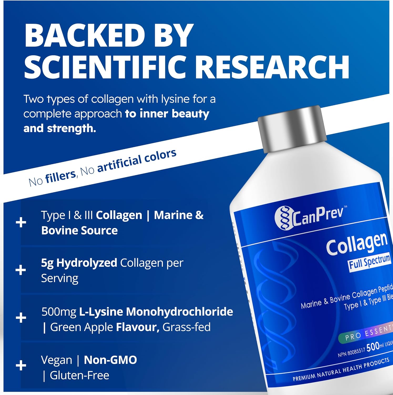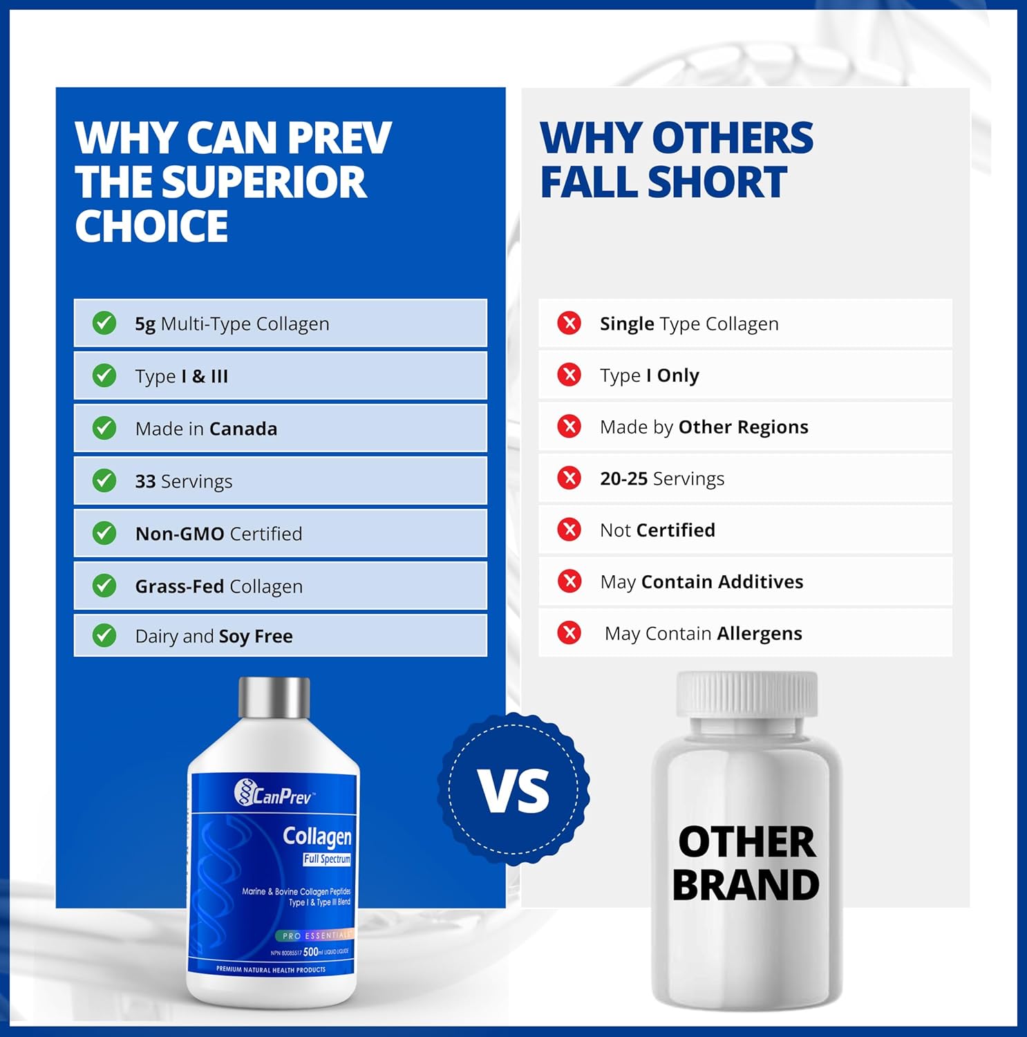 CanPrev Collagen Full Spectrum Blend, 500ml Liquid 33-Servings – Marine and Bovine Collagen Peptides – Helps Build Healthy Skin, Strong Bones, Muscles, Cartilage and Joints – Non-GMO and Gluten-Free