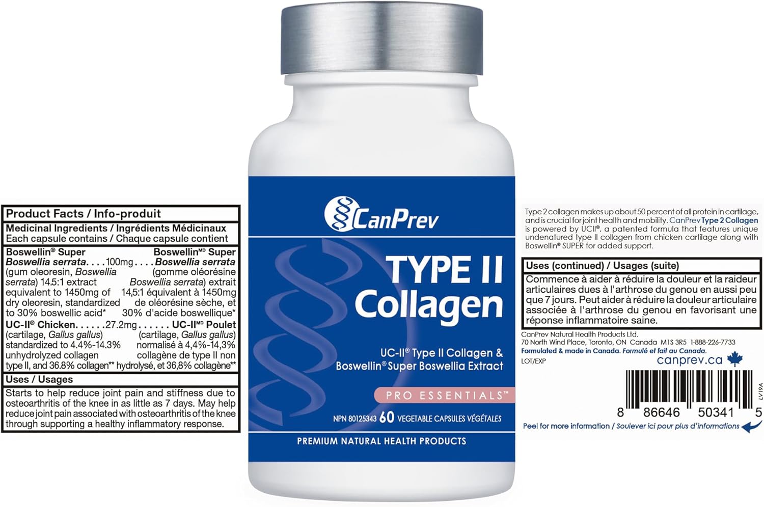 Joint support – CanPrev’s TYPE II Collagen capsules are specially formulated to promote joint health, utilizing type 2 collagen which is known for its potential to enhance joint comfort and mobility.