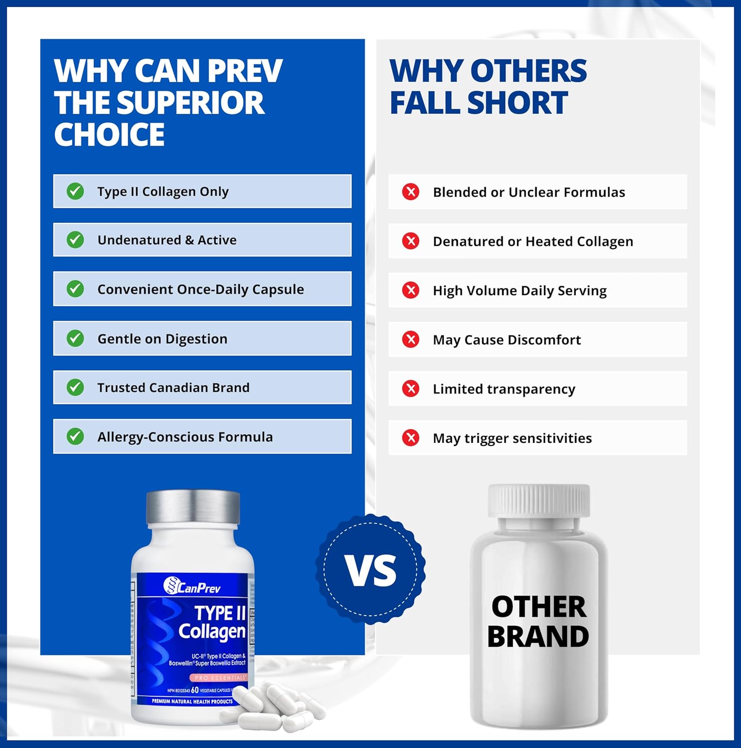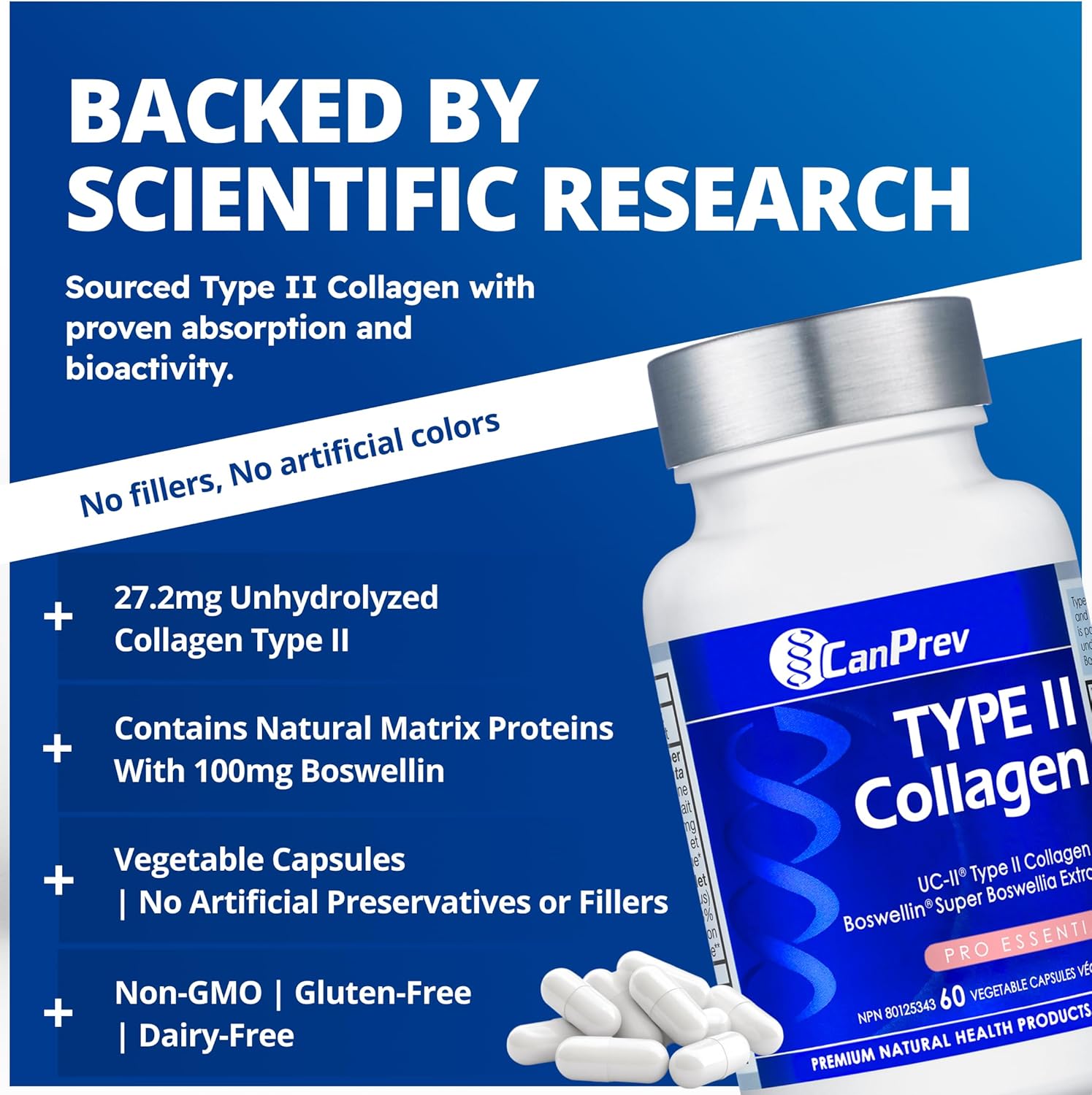 Enhanced bioavailability – CanPrev’s collagen peptides capsules are designed for optimal absorption, ensuring your body maximizes the potential benefits of type 2 collagen for your joints and overall well-being.