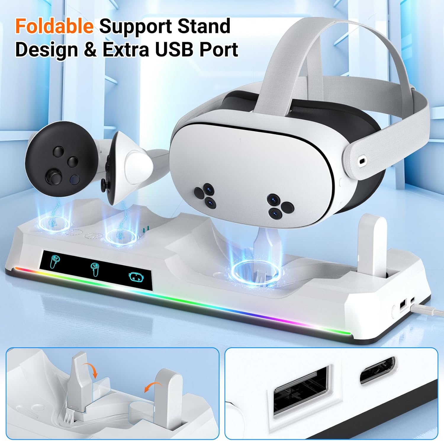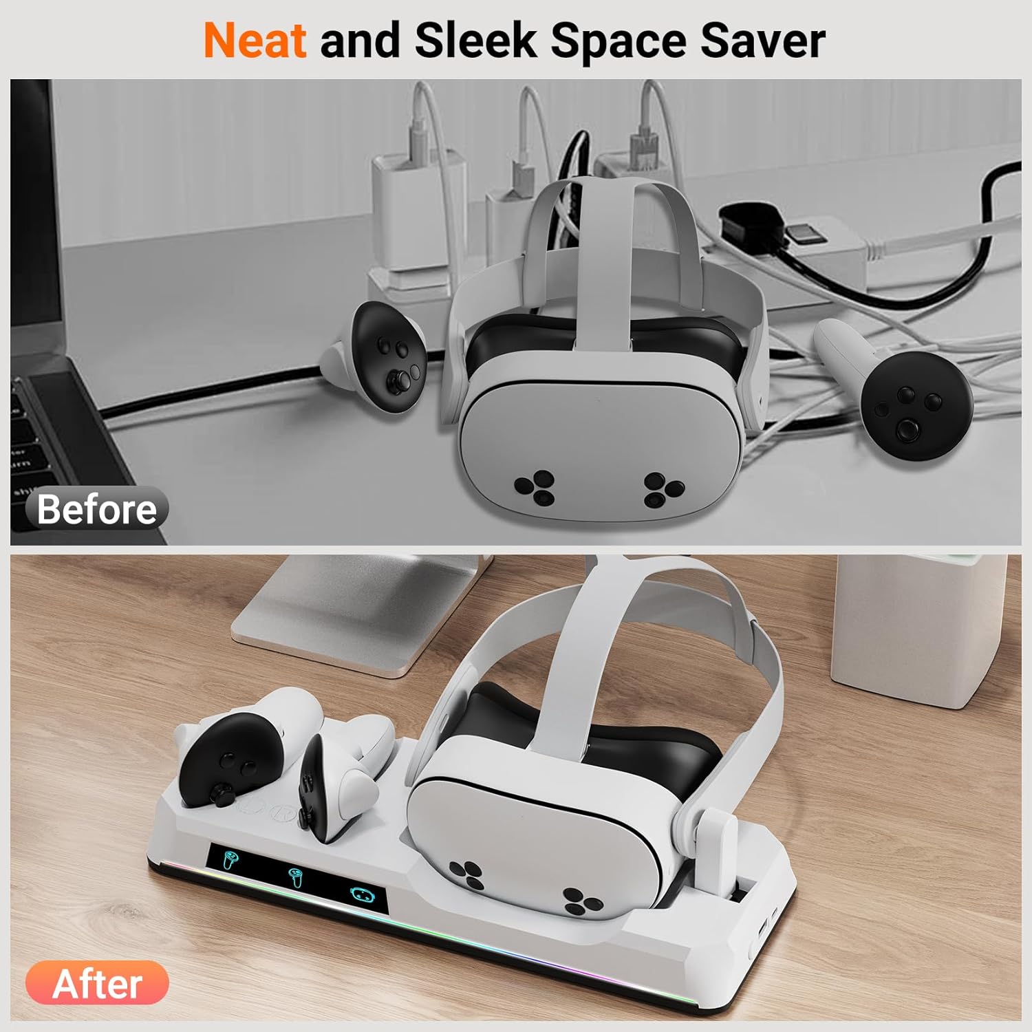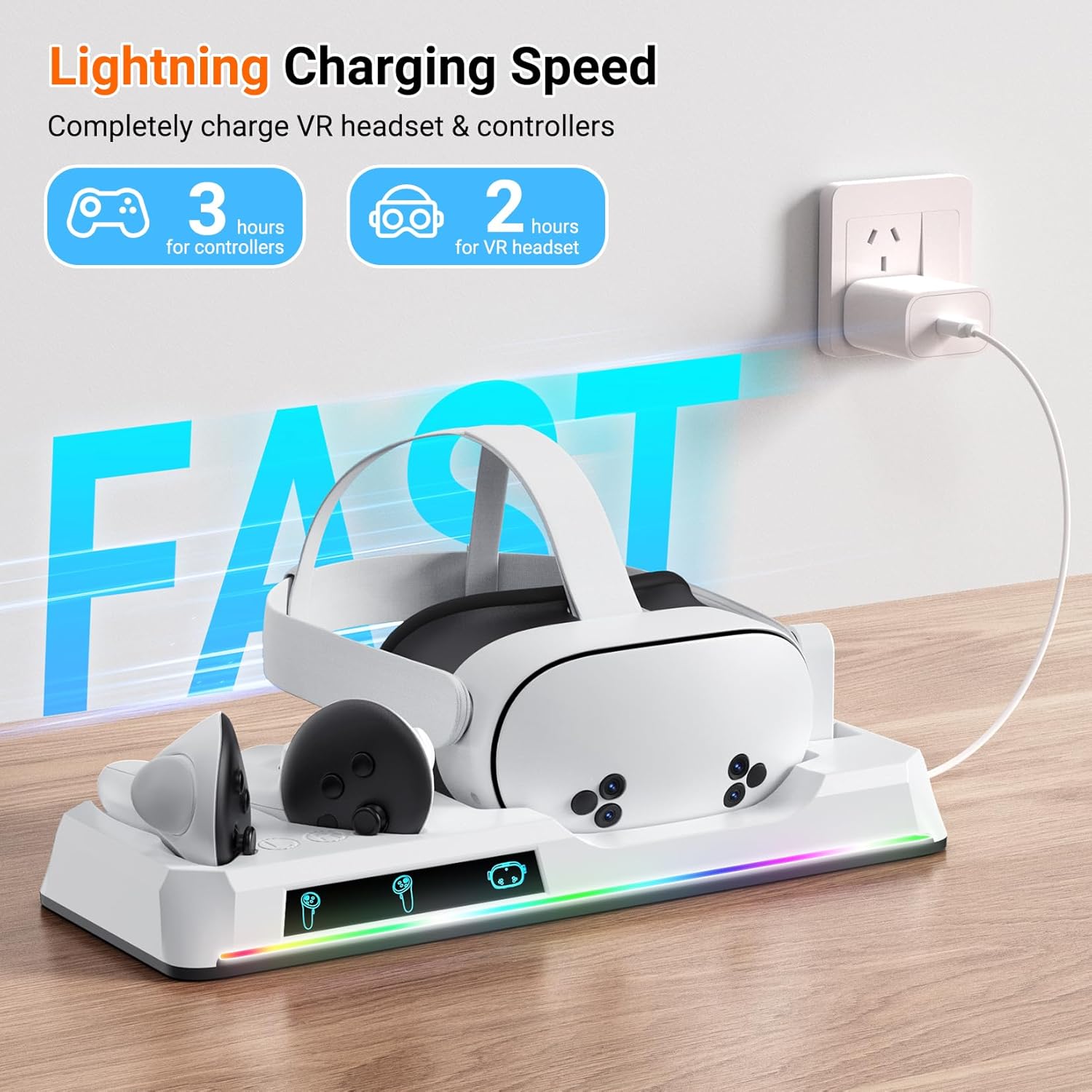 [Organized, Safe, and Reliable Setup]: Keep your gaming space tidy with a dedicated charging base for your VR headset and controllers. Equipped with four silicone pads for added stability, this meta quest charger ensures your devices stay secure and protected while remaining easily accessible for your next VR session.