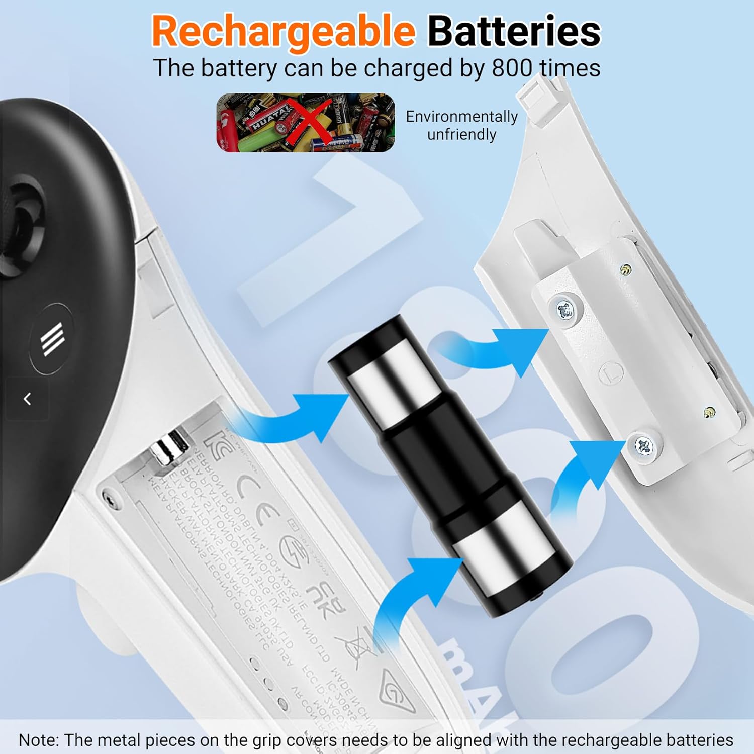 [Eco-Friendly Rechargeable Battery Solution]: The oculus charging station includes controller covers and two custom rechargeable batteries that last over 1,000 cycles. Save money on disposable batteries while embracing a more sustainable approach. These reusable batteries are cost-effective and environmentally friendly, reducing waste and long-term expenses.