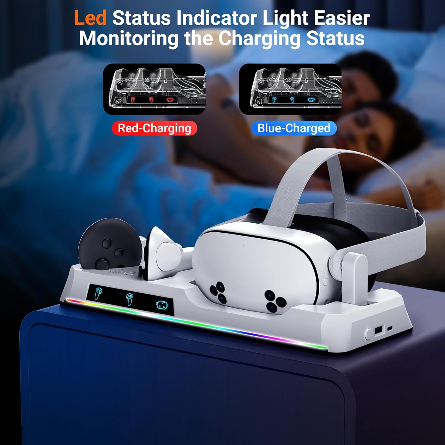 [Smart LED Indicators for VR Accessories Quest 3S]: Stay informed with intelligent LED lights. The oculus quest 3S/3 accessories’s indicators glow red while charging and switch to blue when fully charged, preventing overcharging and extending battery life. Enjoy peace of mind knowing your equipment is protected and always ready to go.