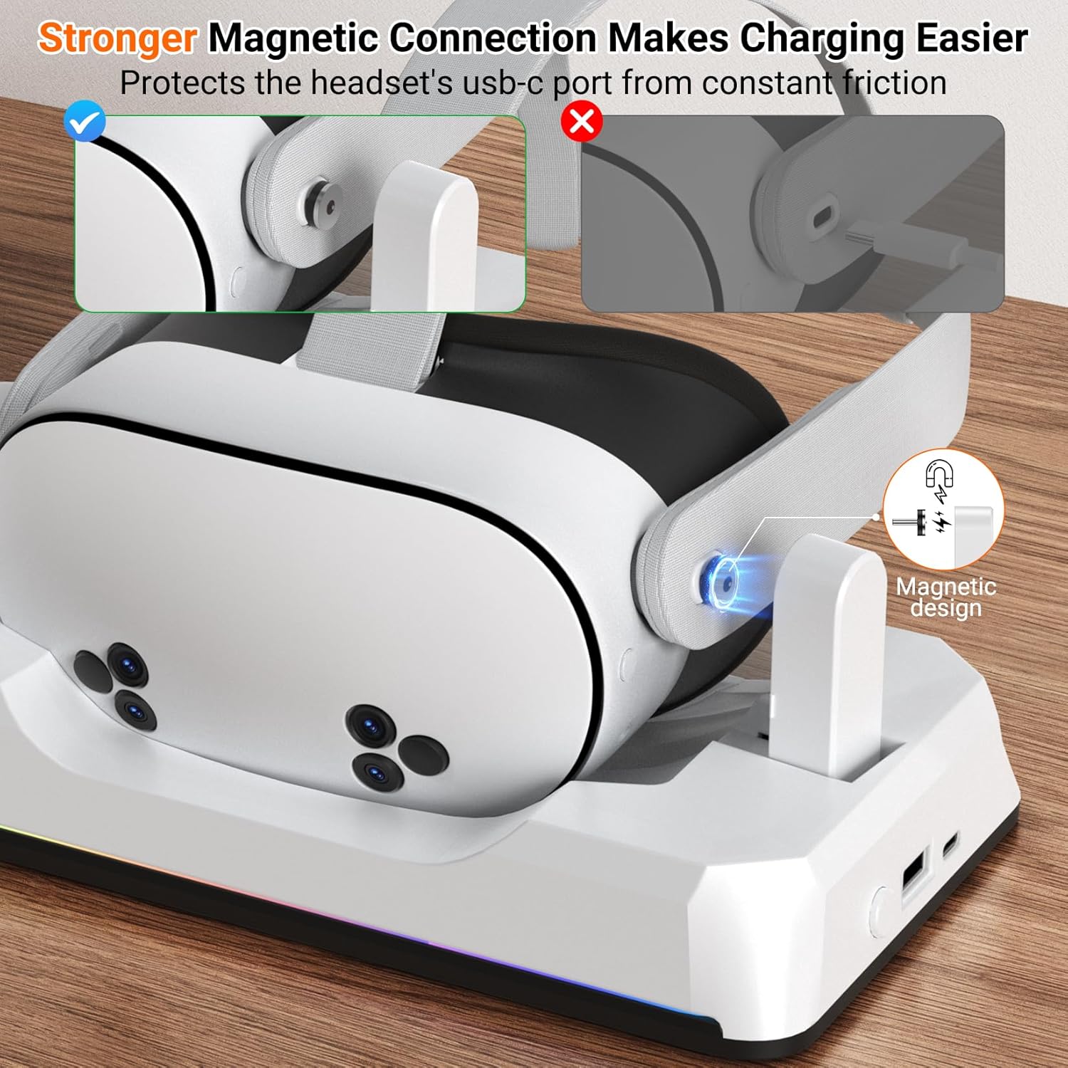 [Magetic Meta Quest 3/3S Accessories]: Say goodbye to tangled cables! The oculus charging dock adopts innovative magnetic design ensures your headset and controllers align perfectly every time. This hassle-free setup provides secure and efficient charging while keeping your gaming area free from clutter.