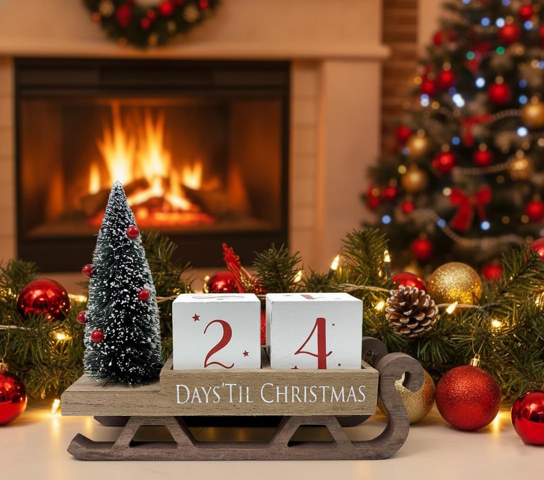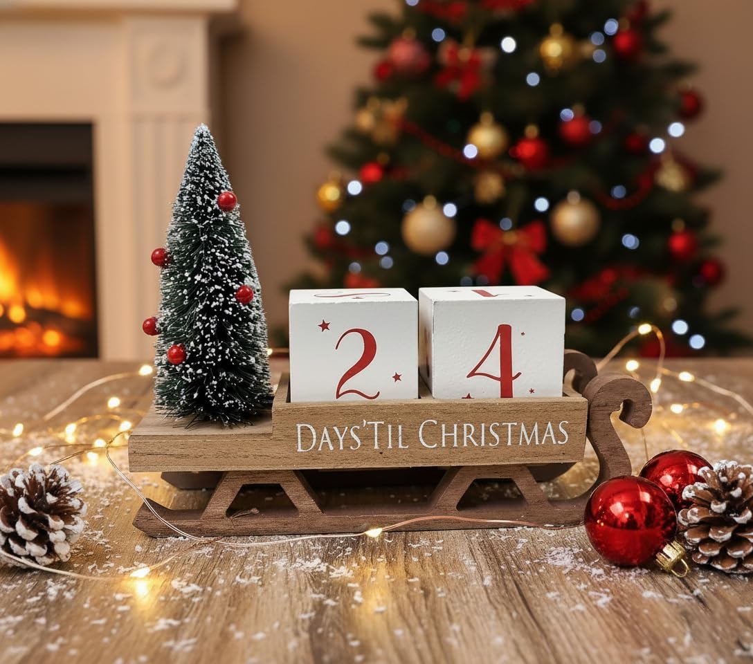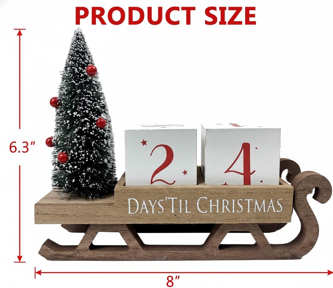 Christmas Countdown Blocks Santa Sleigh Advent Calendar 99 Days Christmas Tree Decorations Wooden Farmhouse Rustic Sign Xmas Party Holiday Décor for Home Living Room, Mantel, Tiered Tray