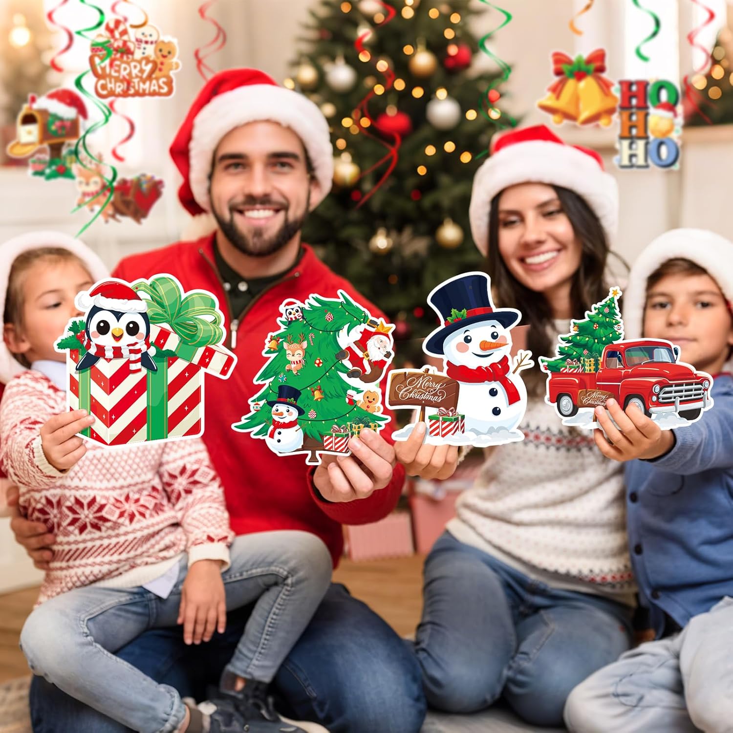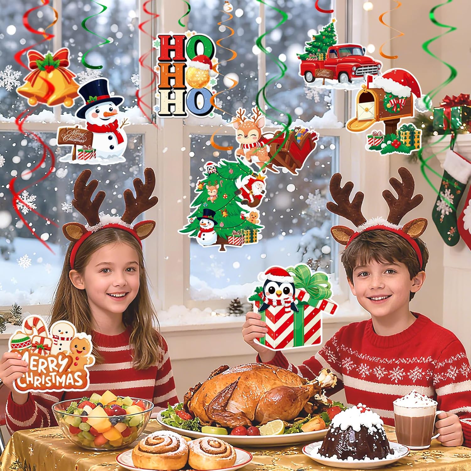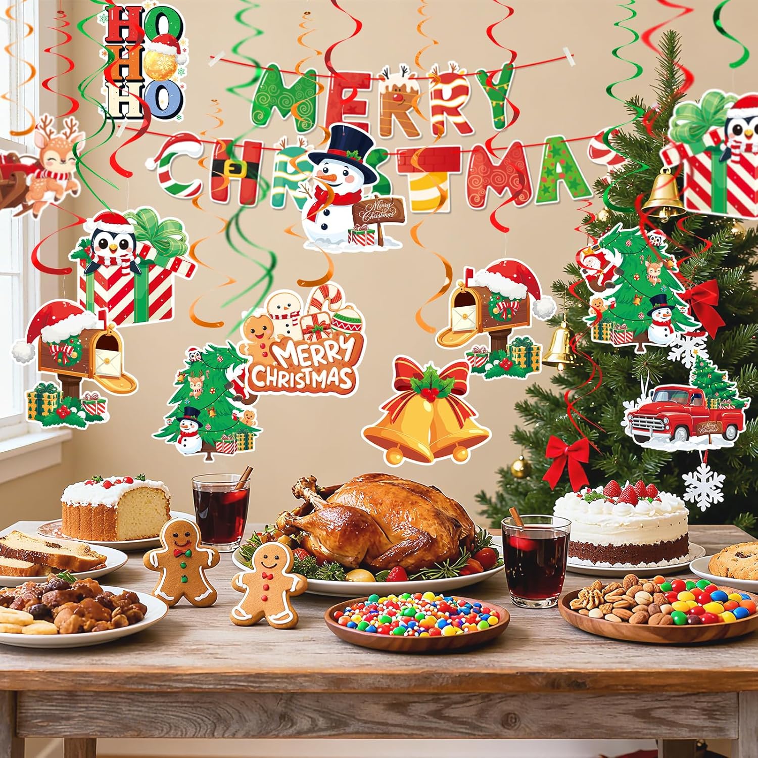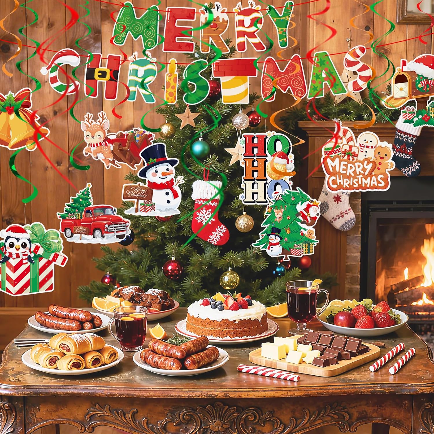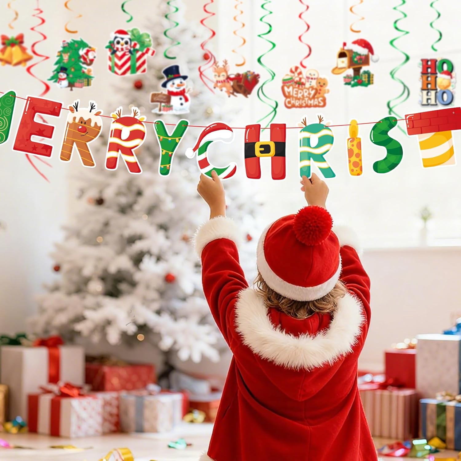 1. Elevate Your Christmas Decor: Elevate your holiday spirit effortlessly with our all-in-one Christmas decoration set. This comprehensive package includes a ready-to-hang Merry Christmas banner, 18 double-sided Christmas-themed cutouts, and 26 swirling decorations. Perfect for adding a warm and welcoming feel to every corner of your home, our set requires no assembly, making your festive preparation a breeze.