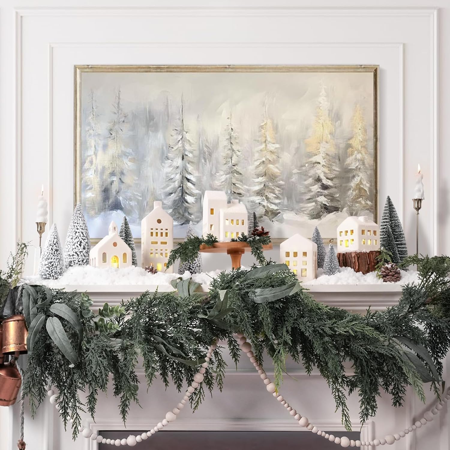 CHRISTMAS VILLAGE SET: Includes 5 ceramic village houses, 9 mini snowy Christmas trees, 5 LED tea lights, and a remote control, creating a magical winter wonderland in one package.