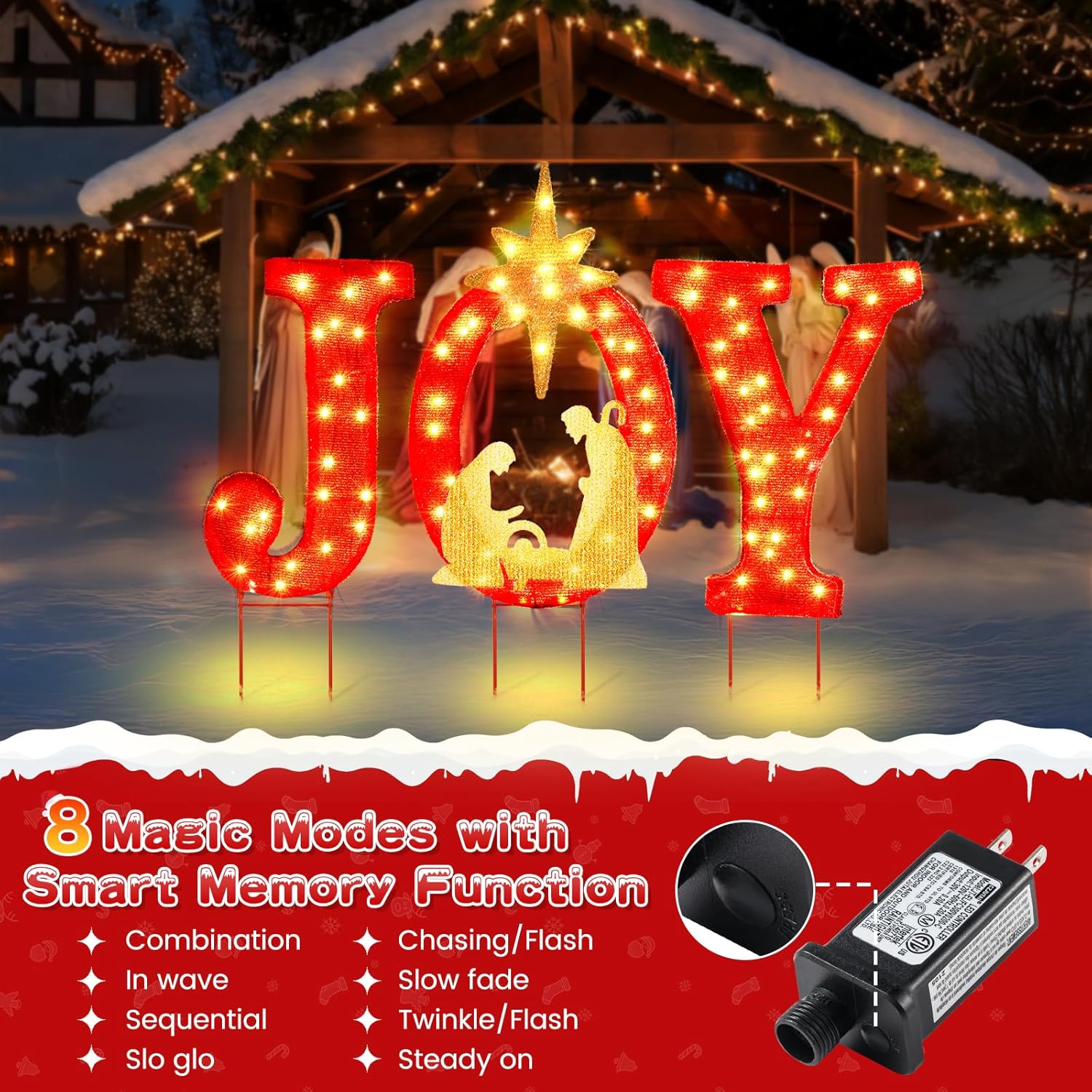 【JOY Nativity Set for Christmas】90 warm white LEDs are expertly distributed across the massive “J”, “O”, and “Y” letters. The high-light-transmission red fabric brilliantly amplifies their glow, creating an incredibly vibrant and radiant display. Topped with a removable Bethlehem star and bottomed with sacred Nativity figures. This 3 piece Nativity set ensures your yard stands out day and night. Ideal for enhancing Christmas spirit while honoring traditional symbolism.