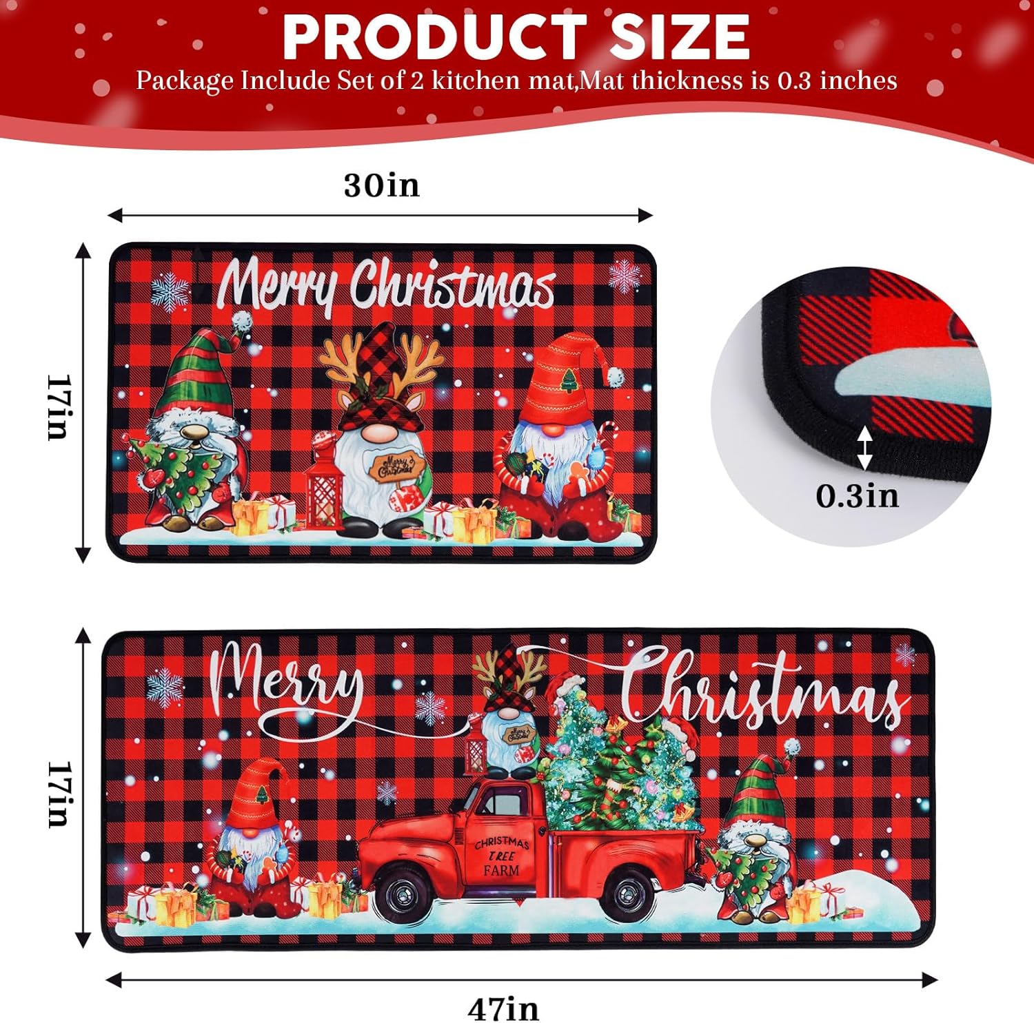 🎉 Funny Christmas Holiday Design: Our Christmas kitchen mats are adorned with an intricate holiday design that captures the magic of the season. From the fun Christmas gnome and red Christmas truck, plus the classic red and black buffalo checkered background,, every element has been carefully crafted to infuse your kitchen with the spirit of Christmas.