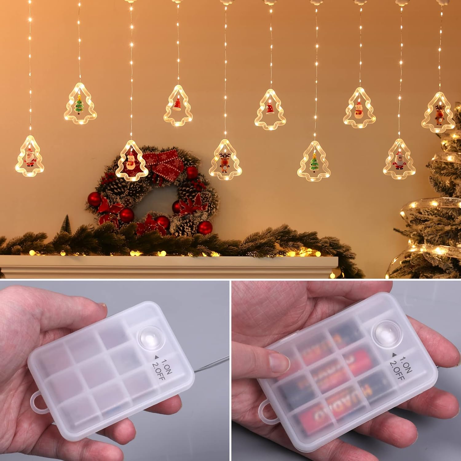 9.84Ft curtain string lights with 120 Warm White LEDs, made of good quality material. Durable, not easy to break apart.These mini lights strings are IP65 Waterproof designed lights (except the USB interface), perfect for indoor and outdoor decorations.3D string lights include 2 Santas, 2 Christmas trees, 2 Snowman, 2 Christmas Elk, 2 Christmas hats as pendants for the holiday lights.