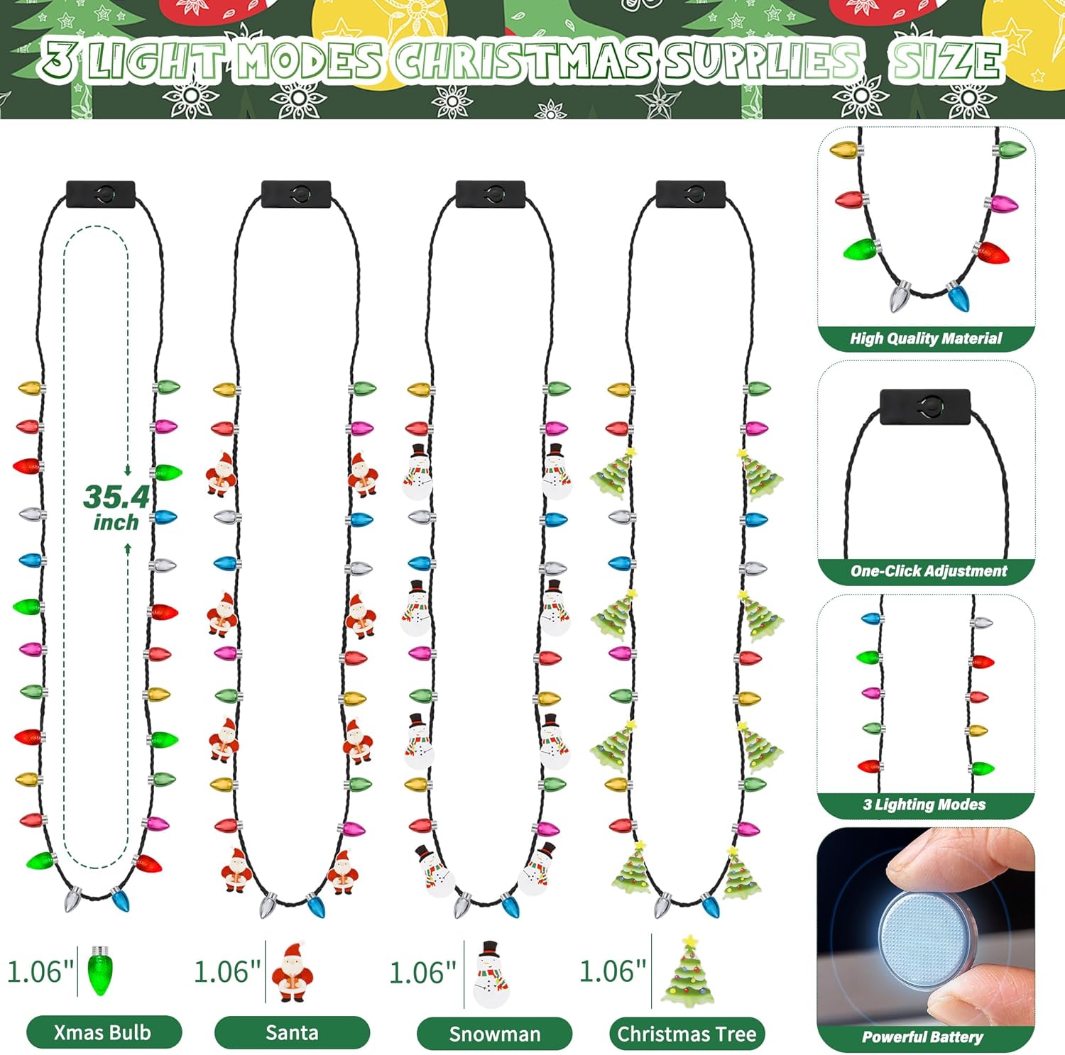 What You Get – Receive 4pcs of the Christmas Light up Necklace, featuring 26 colorful bulbs. Let the LED necklace make your Christmas Day truly memorable.