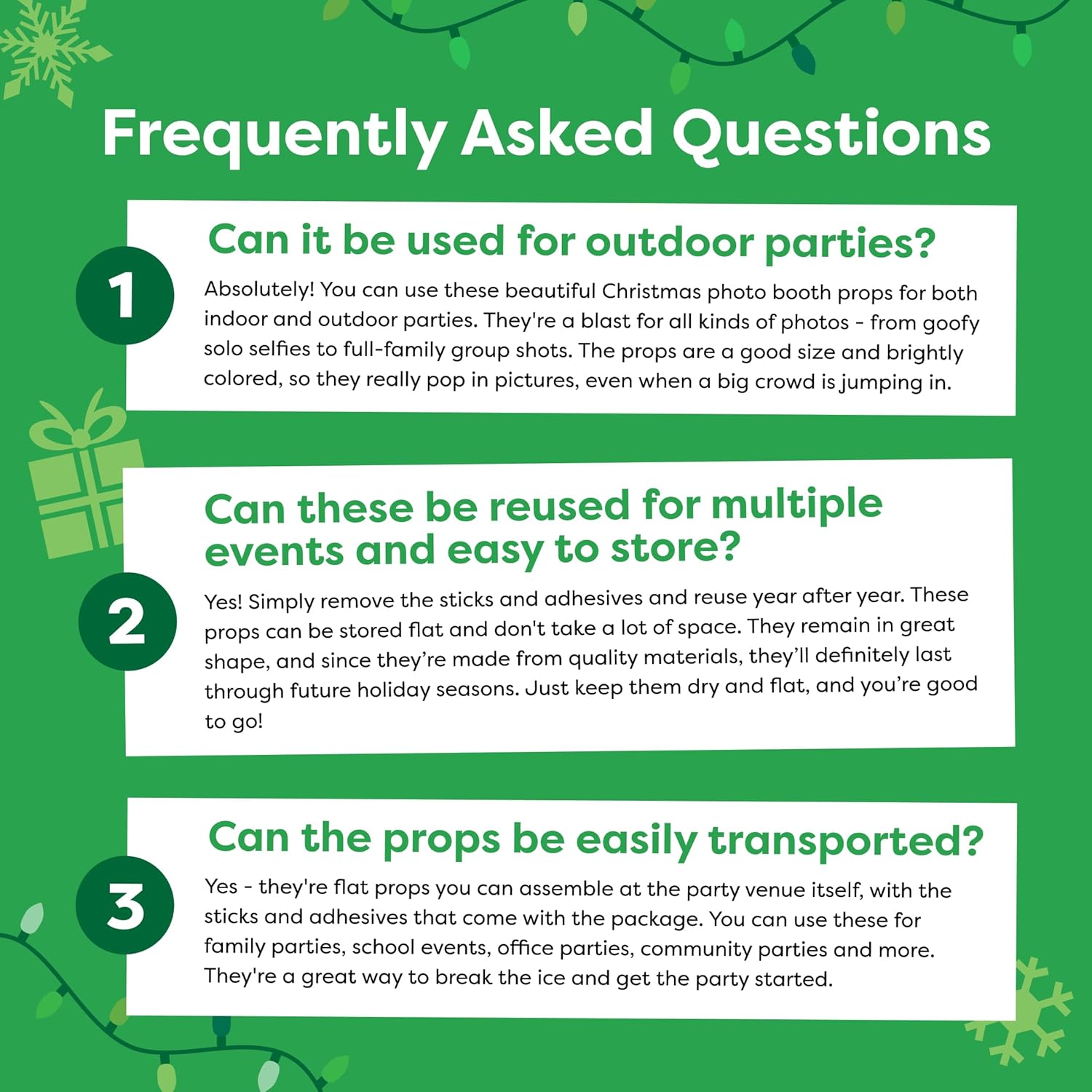 Built for Fun and Made to Last. Our photo booth props Christmas kit features strong adhesive, premium sticks, and durable cardstock to ensure your Christmas selfies and group shots stay picture-perfect. These reusable Christmas photo booth props are comfortable for adults and kids, providing lasting value for holiday parties, family gatherings, and office events with vibrant and sturdy styling.