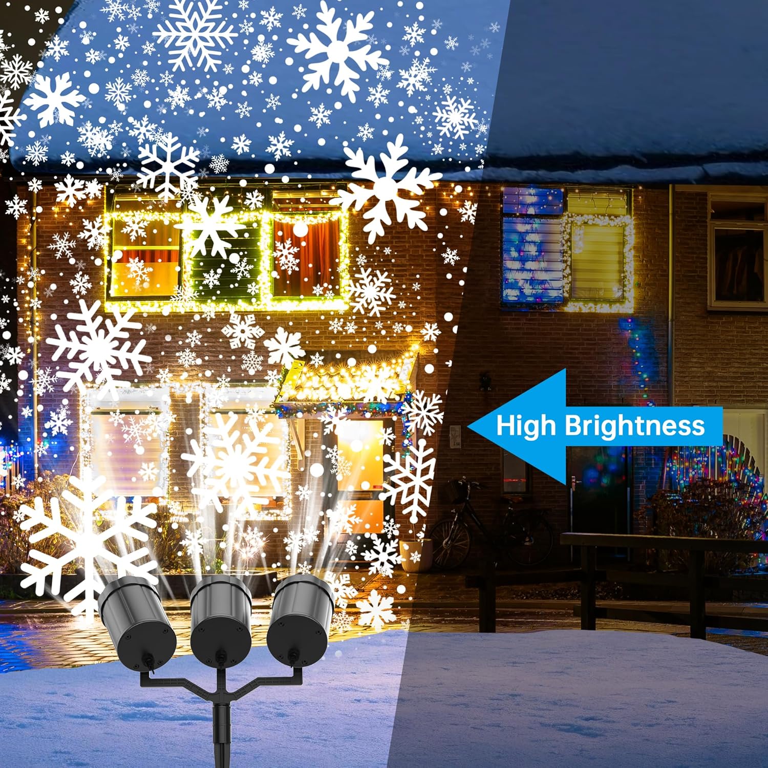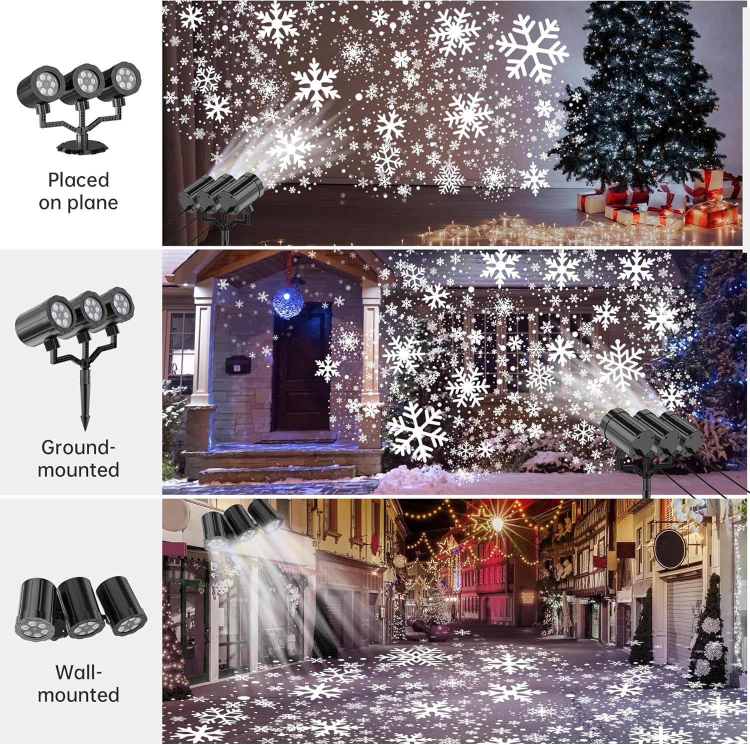 Projecting Fantasy Snowflakes: Triple head snowflake projector light has 12 built-in high-brightness beads, combined with 5 different snowflake patterns, projecting bigger, brighter and clearer snowflakes, as if snowflakes are falling from the sky