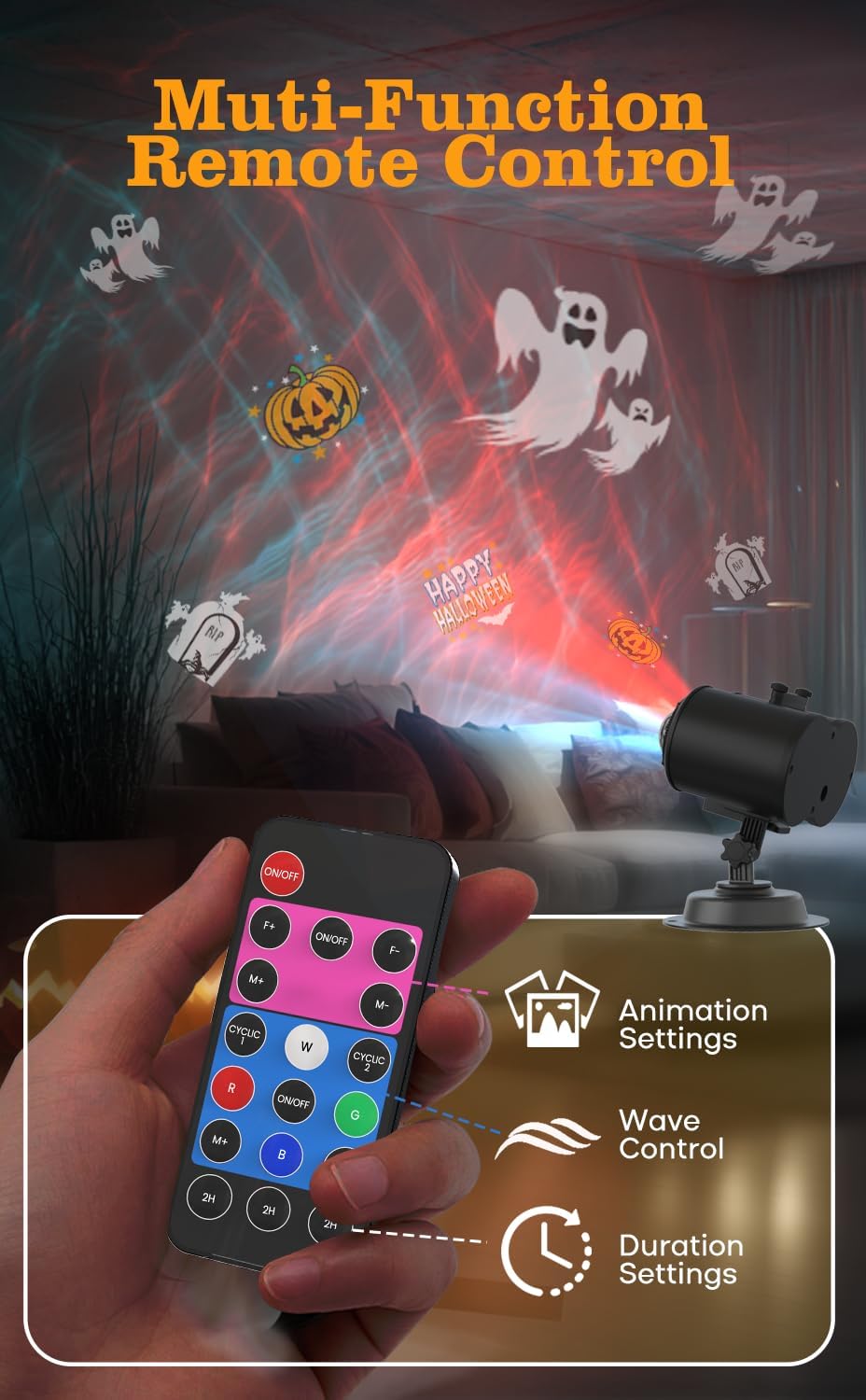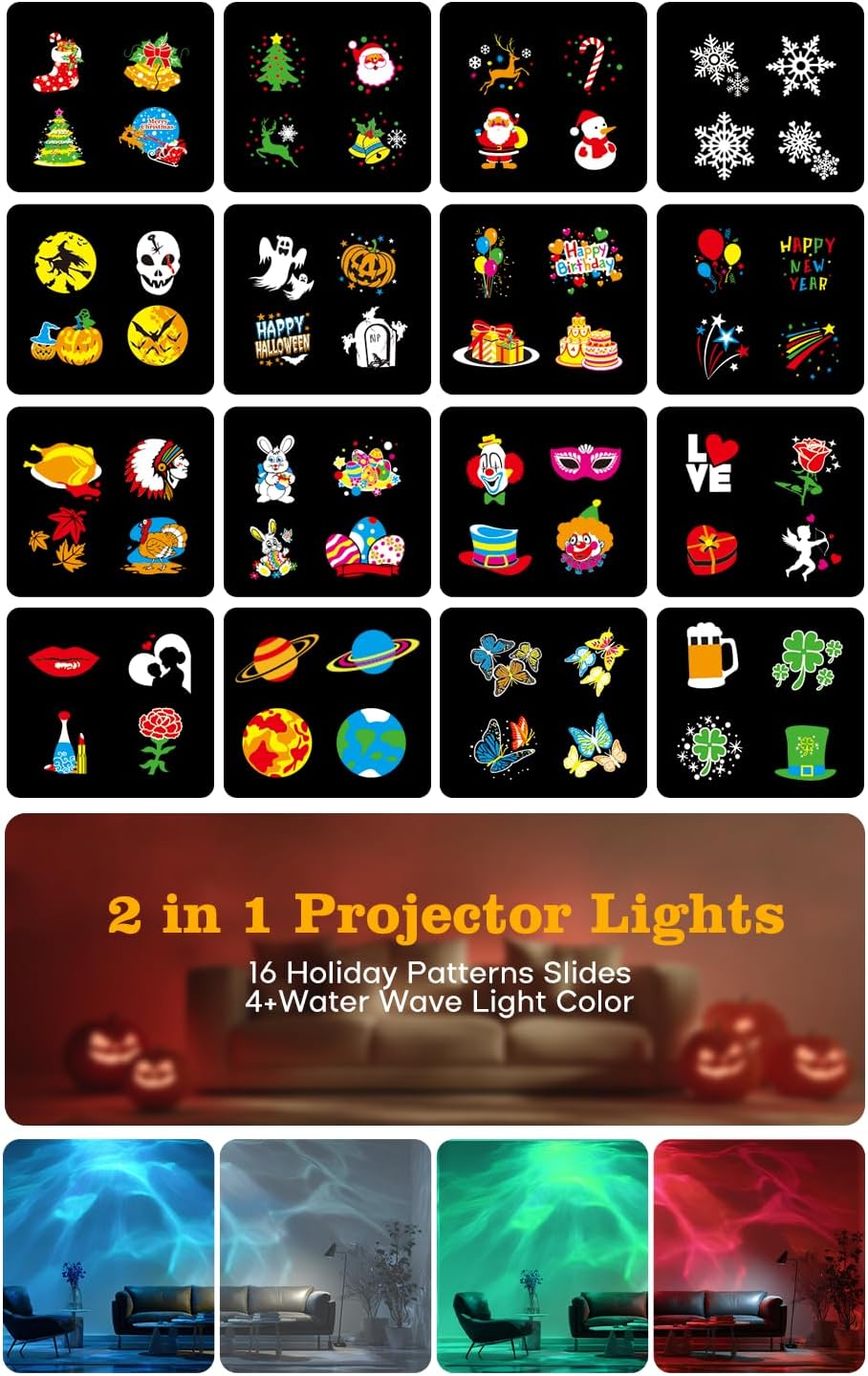 Immersive Dual Effects Christmas Lights Projector: Dynamic Water Waves & 16 Holiday Themes. Experience two stunning effects in one projector! Create serene underwater ambiance with flowing water waves (4+ color modes) or switch between 16 themed slides for holidays like Christmas, Halloween, and Thanksgiving. Easily transition between modes to perfectly match any festive atmosphere