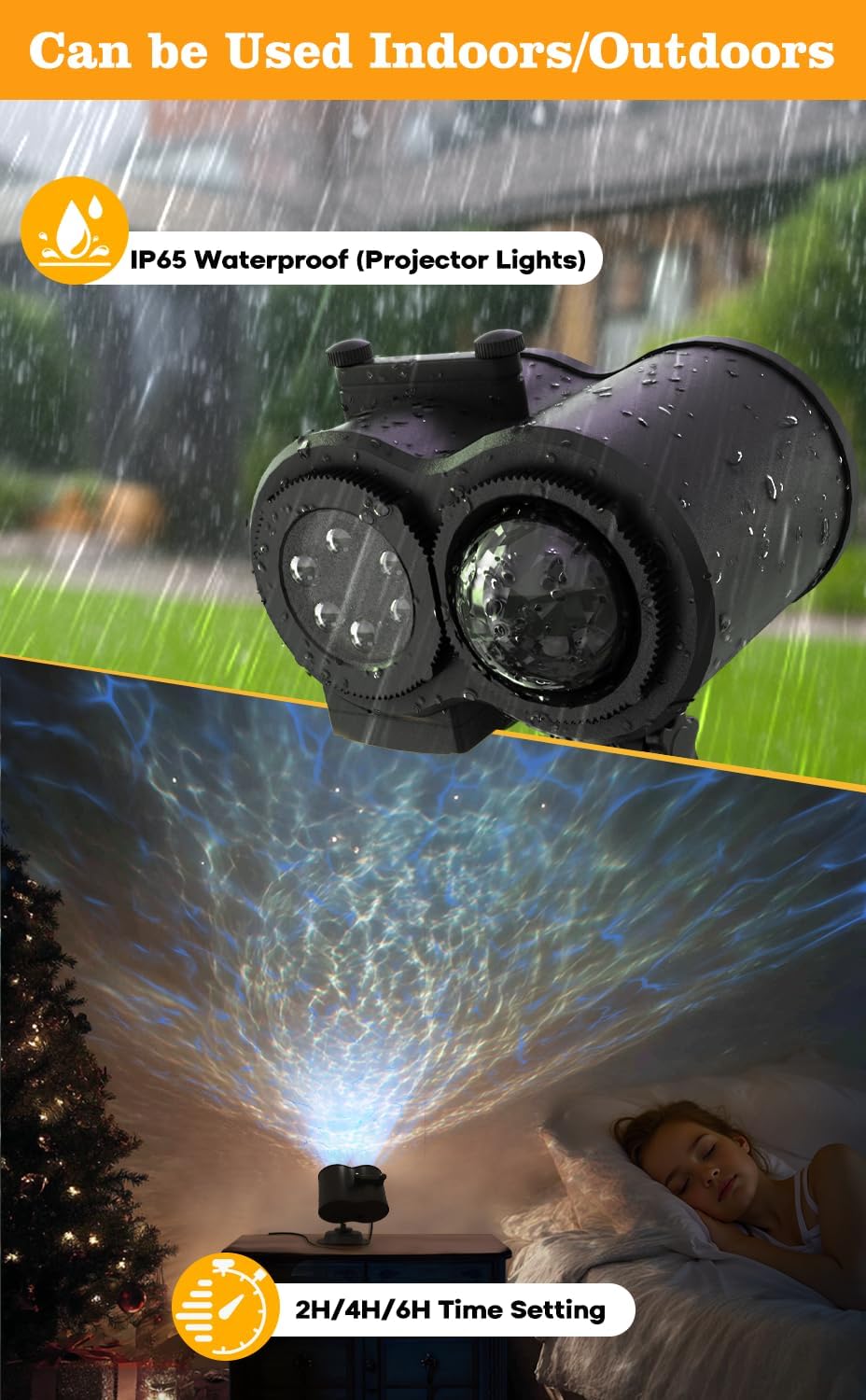 All-Weather Durability: IP65 & IP44 Rated for Indoors/Outdoors. Built to last in all seasons! The kids night light projector features an IP65 waterproof rating to resist rain and snow, while the adapter is IP44 rated. Enjoy complete peace of mind for outdoor christmas decorations