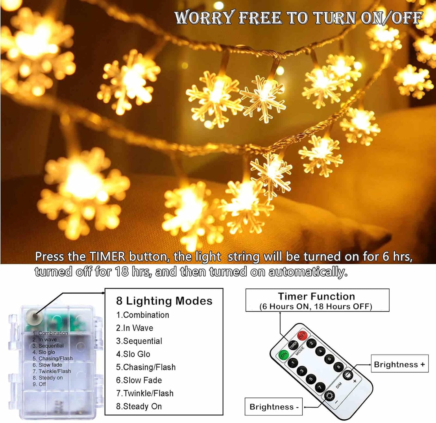 8 Modes: Our Christmas snowflake string lights have 8 lighting modes (combination, in wave, sequential, slo glo, chasing/flash, slow fade, twinkle/flash, steady on); 8 Functions to fit different occasions, moods, feelings, holidays, festivals, anniversaries, etc; Satisfied different requirements; Changing the lighting mode by pressing the round button on the battery box or using the remote control, different patterns represent different moods