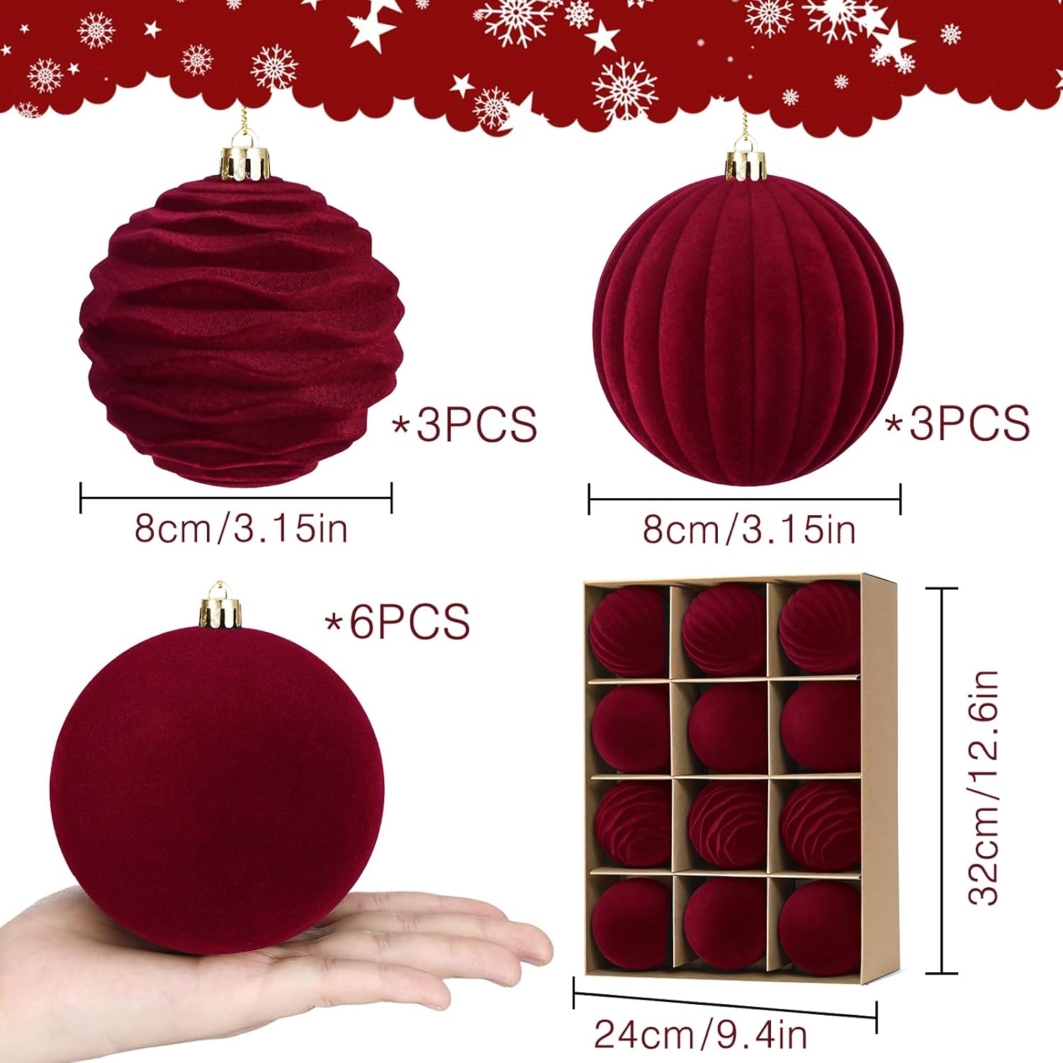 🎄 12 PCS COMBINATIONS: This red velvet Christmas ornaments set contains 12pcs 3.15inch balls. Our Christmas balls can be flexibly matched with different levels of Christmas trees, wreath, garland, wall hanging or other locations, making the decoration more layered and three-dimensional, break away monotony.