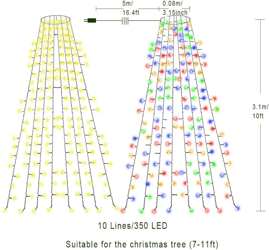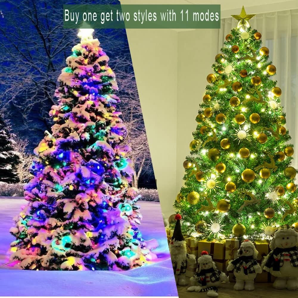 Christmas Tree Lights:350 LED Warm White & Multicolor color changing lights add a nice atmosphere to your Christmas.Hang this string lights for your Christmas tree,you can adjust 11 different light modes and 2 colors (warm white and multicolor) to make your Christmas tree more vivid and beautiful.