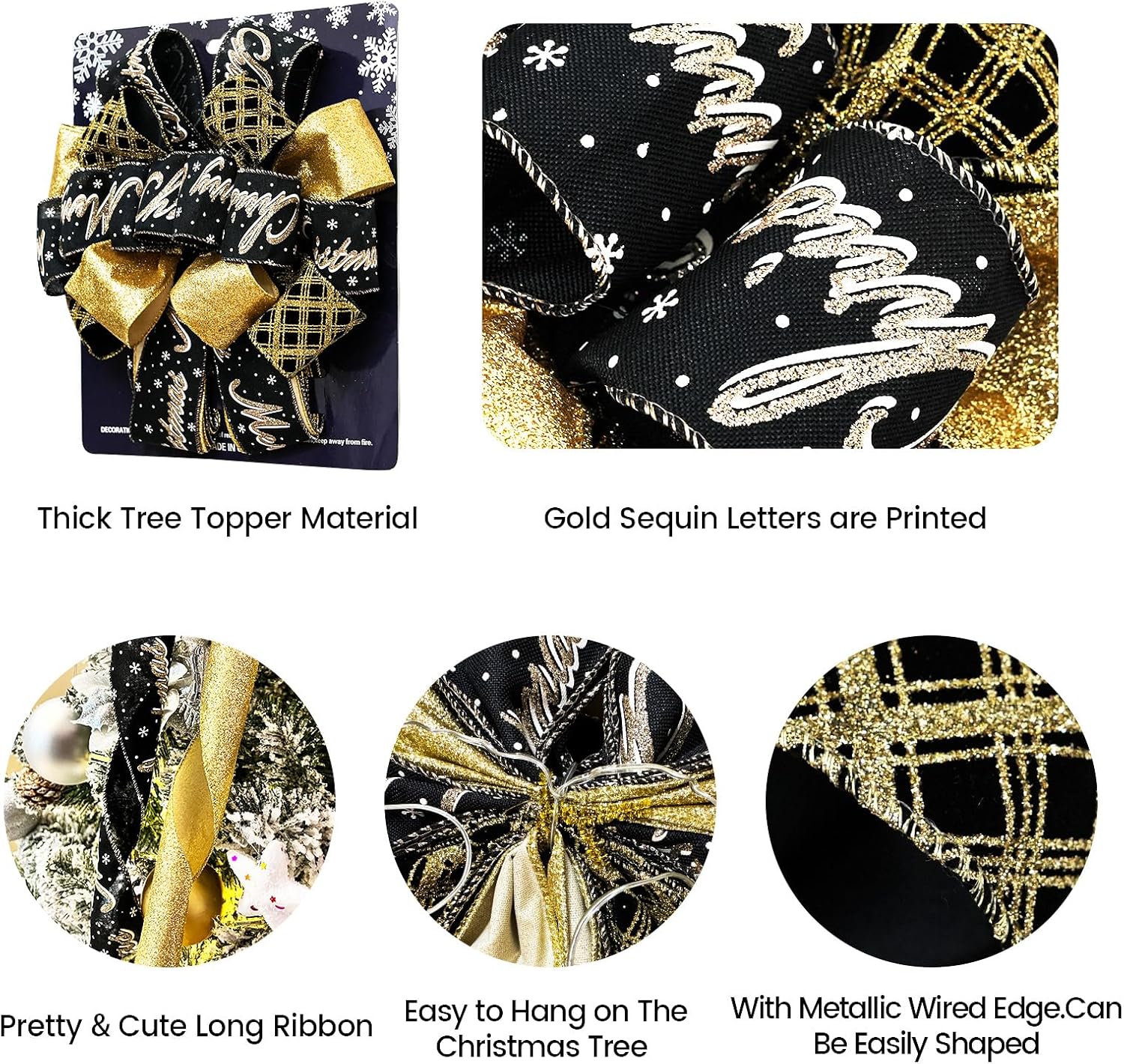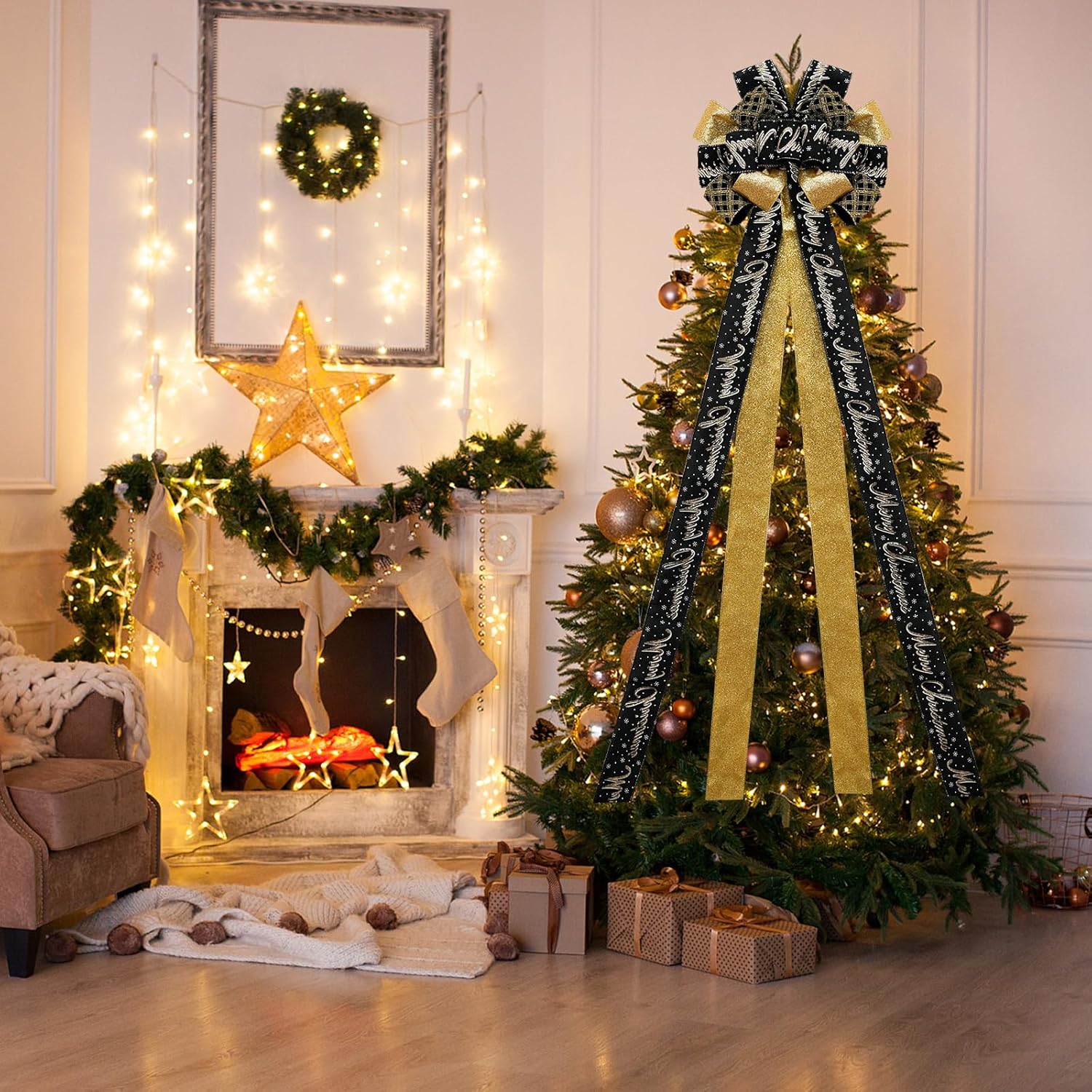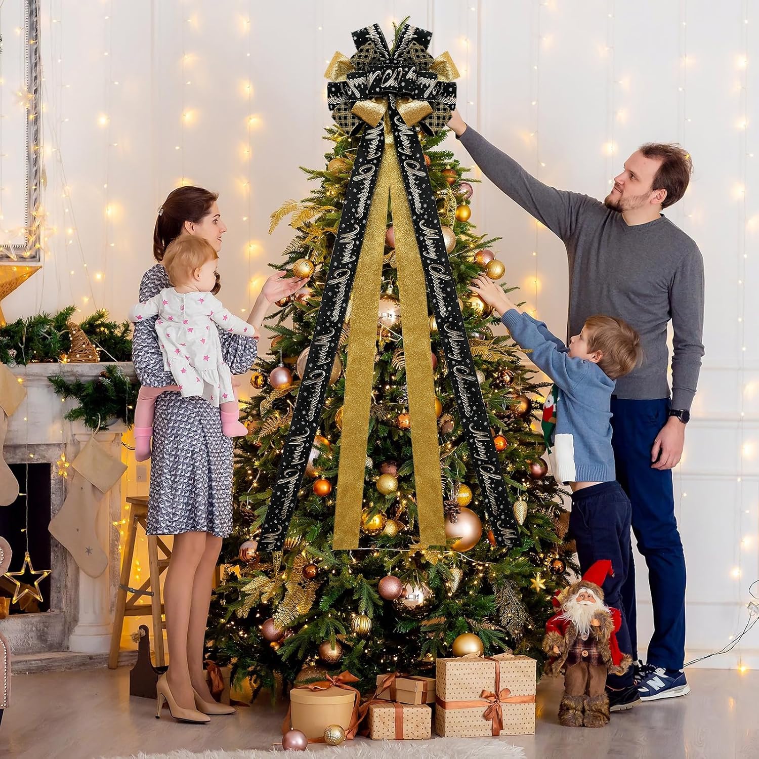 Xmas Decorations for Home: Xmas Bow ribbon surface printed with gold sequin letters, which is very shiny.Perfect for spreading holiday spirit and bring good luck to whole family.Those Xmas tree topper make your Christmas tree more beautiful/warm/vivid and makes your home look more Christmas atmosphere,allowing you and your family to spend an unforgettable Christmas.Our large christmas tree bows is the best bow for Christmas tree and will surely bring you and your family a surprise