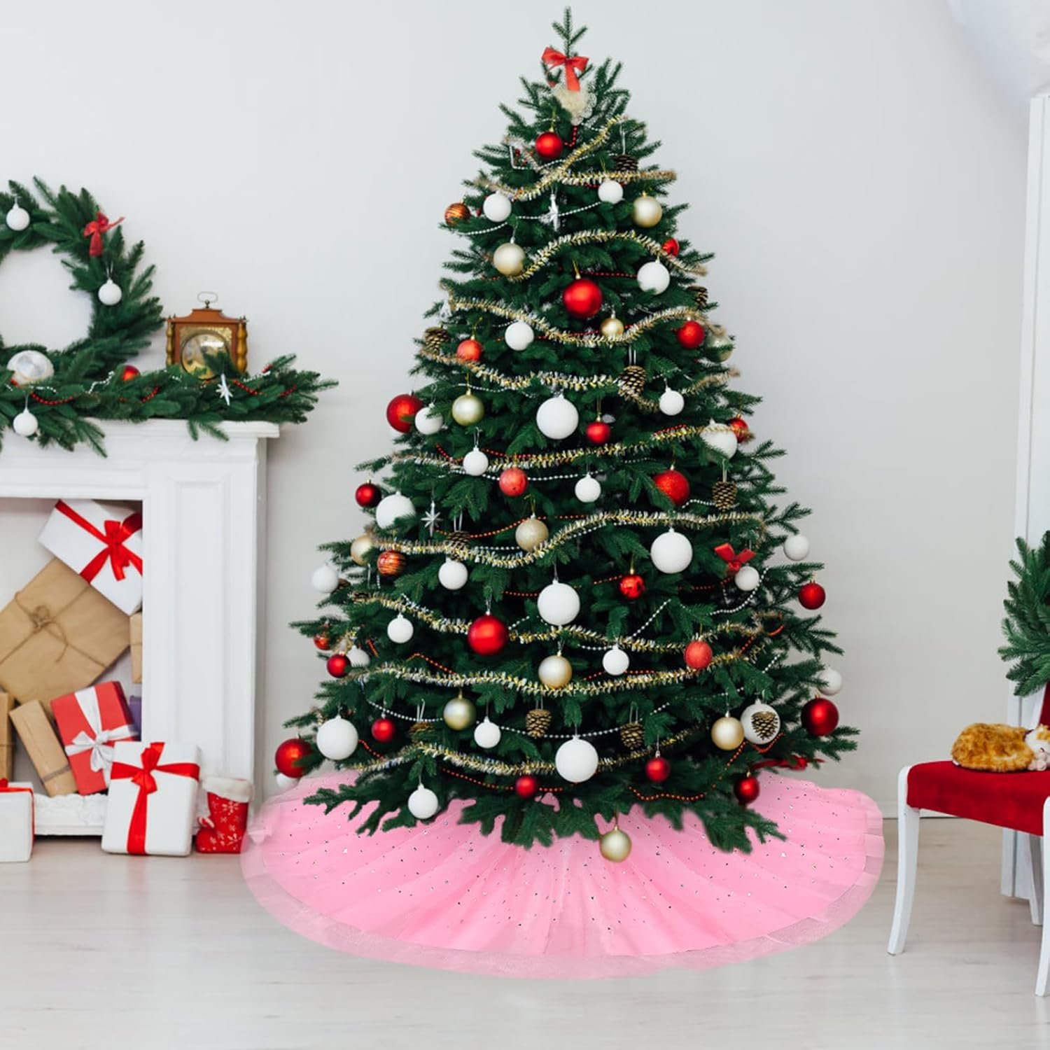 4 layer thickening design The 4-layer pleated skirt style design is very fluffy and very beautiful! The mesh gauze adopts the latest technology, the sequins on it are stronger and won’t fall off easily, and the light shines on the skirt of the Christmas tree, no matter which angle you look at, the skirt will sparkle.