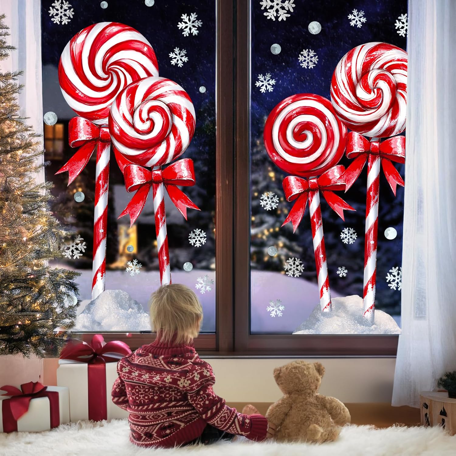 NOVAL DESIGN: The Christmas window clings feature 2 extra large classic peppermint lollipop candies stacked on the snow, with snowflake surrounding. The vibrant red and white peppermints add a pop of classic Christmas color, creating a cozy and festive holiday atmosphere to your Christmas decor.