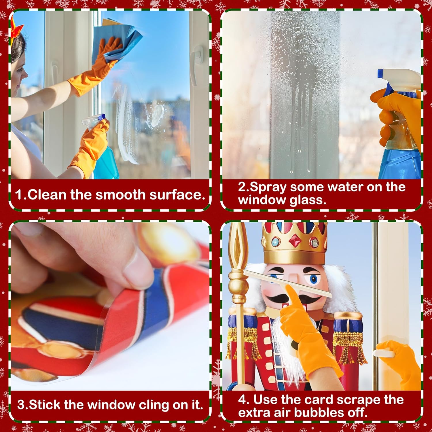 Put On Nutcracker Window Clings Easily – This Christmas window decals are THIN STATIC clings.No adhesive or glue needed,Just clean the surface of the pasted object before pasting,so that the window sticker can work normally for a long time.Bright colors and clear patterns,I am sure you will look forward to this window clings!