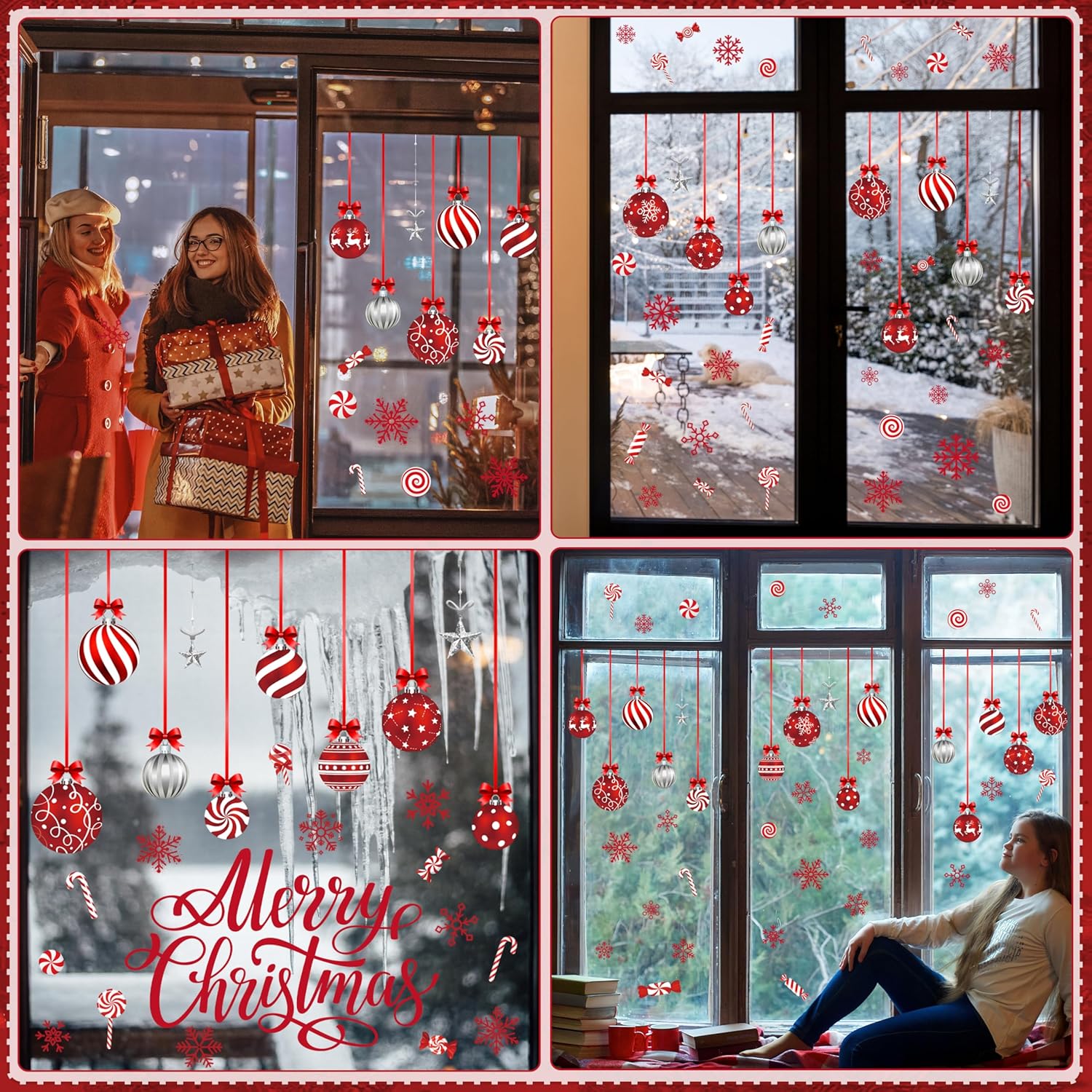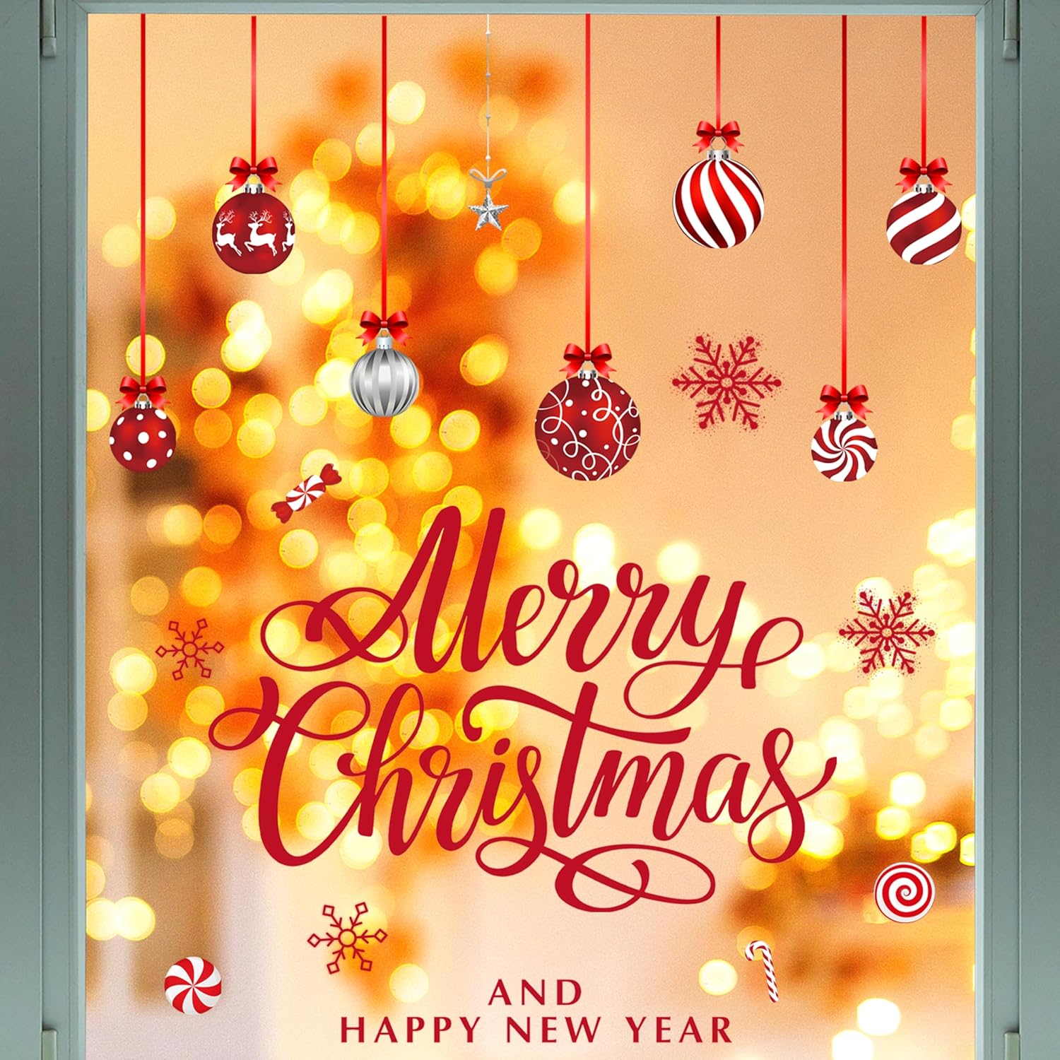 Christmas Window Clings, Merry Christmas Ball Candy Snowflake Decals Stickers, Removable Happy New Year Christmas Window Decorations for Glass Windows Xmas Holiday Home Office Decor