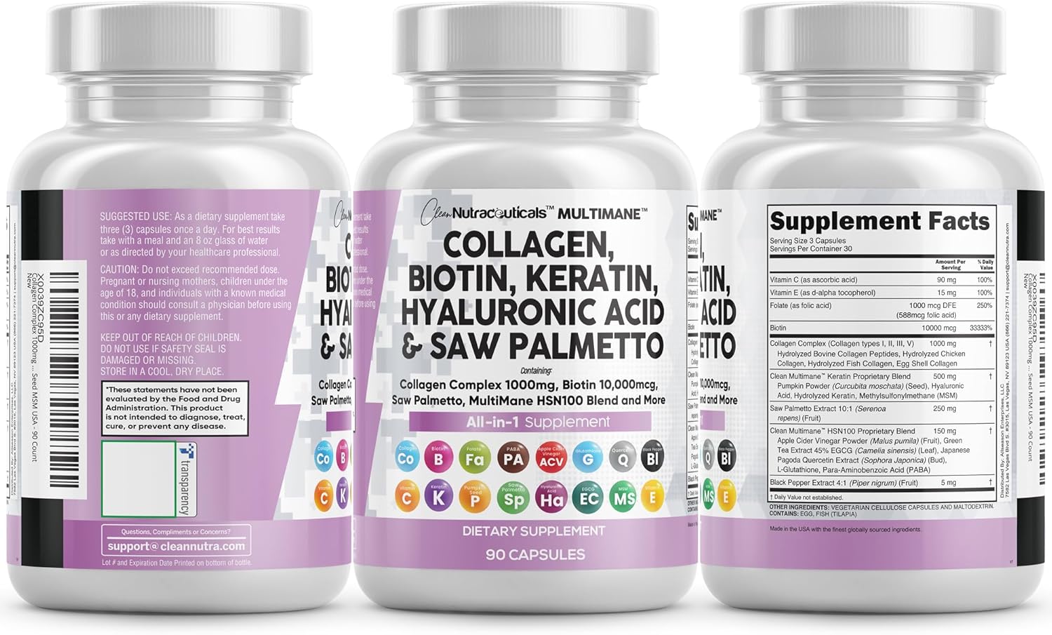 MultiMane Keratin and HSN100 Blends – With 6 full hair growth vitamins for women and collagen for hair growth included above, our formula also contains hair and nails vitamins for women such as hyaluronic acid capsules, pumpkin seed, MSM, PABA, glutathione, apple cider vinegar, a dht blocker for women hair growth and dht blocker for men! These 16-in-1 skin vitamins for women are packed with collagen vitamins, marine collagen capsules, biotin capsules, hyaluronic acid pills and collagen complex.