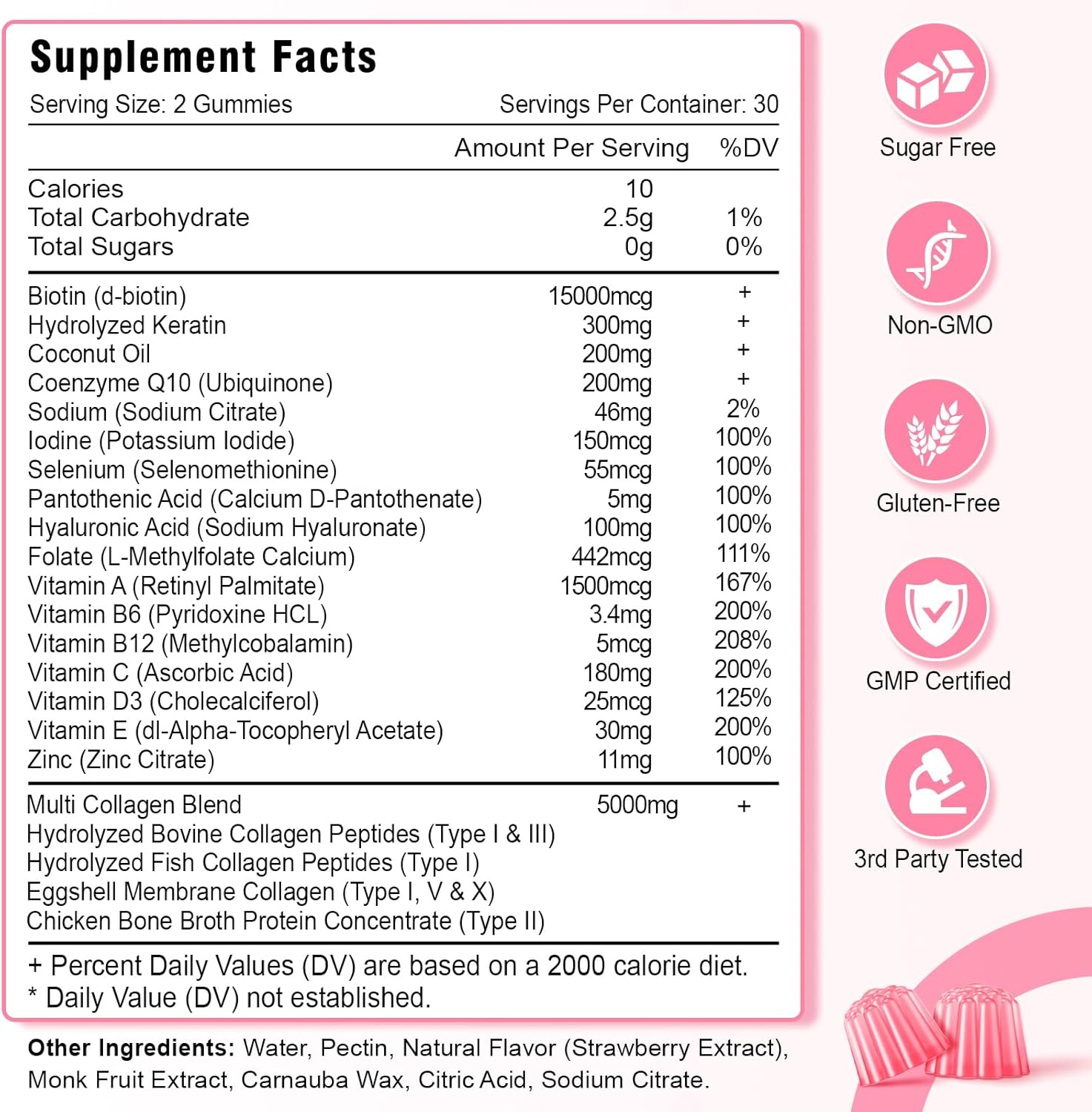 18-IN-1 Powerful Formula: Each serving of 2 multi collagen gummies contains a blend of hydrolyzed collagen, biotin, hydrolyzed keratin, coconut oil, CoQ10, sodium, iodine, selenium, pantothenic acid, hyaluronic acid, folate, zinc, and vitamins A, B6, B12, C, D3, and E. These collagen gummies aim to promote overall health, helping achieve a healthier lifestyle