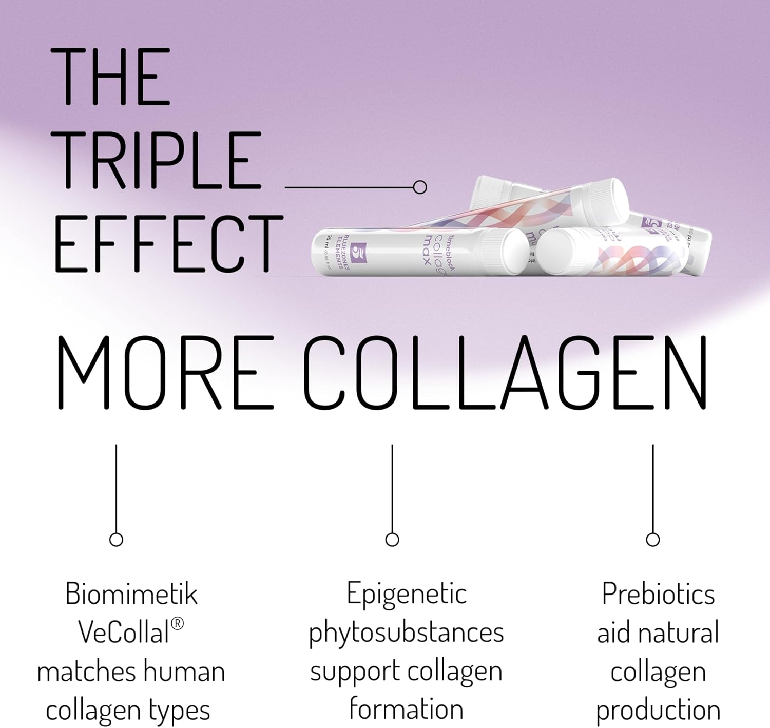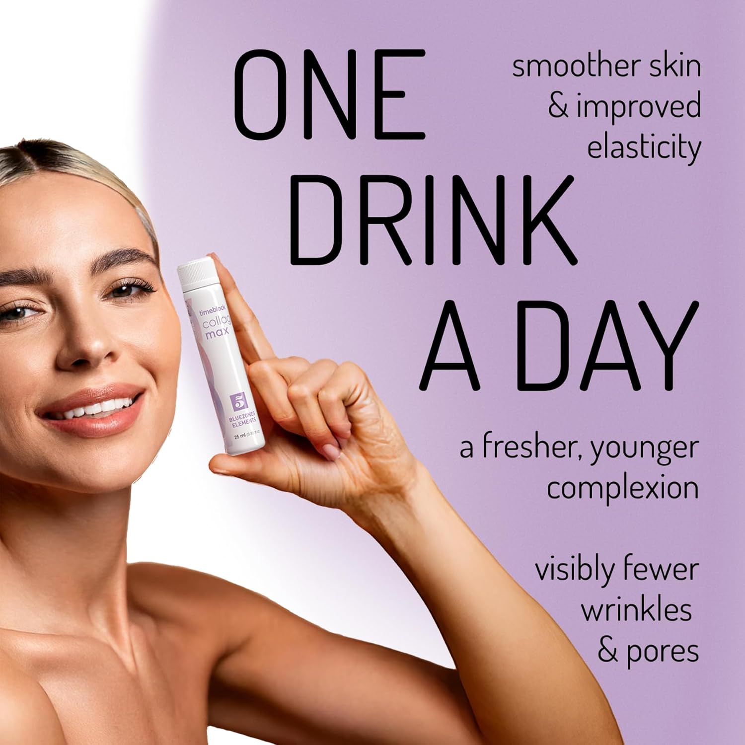 timeblock Collagenmax delivers bioidentical amino acids to support collagen production, phytonutrients to nourish skin health, and essential vitamins that contribute to skin elasticity, hair strength, and nail resilience.