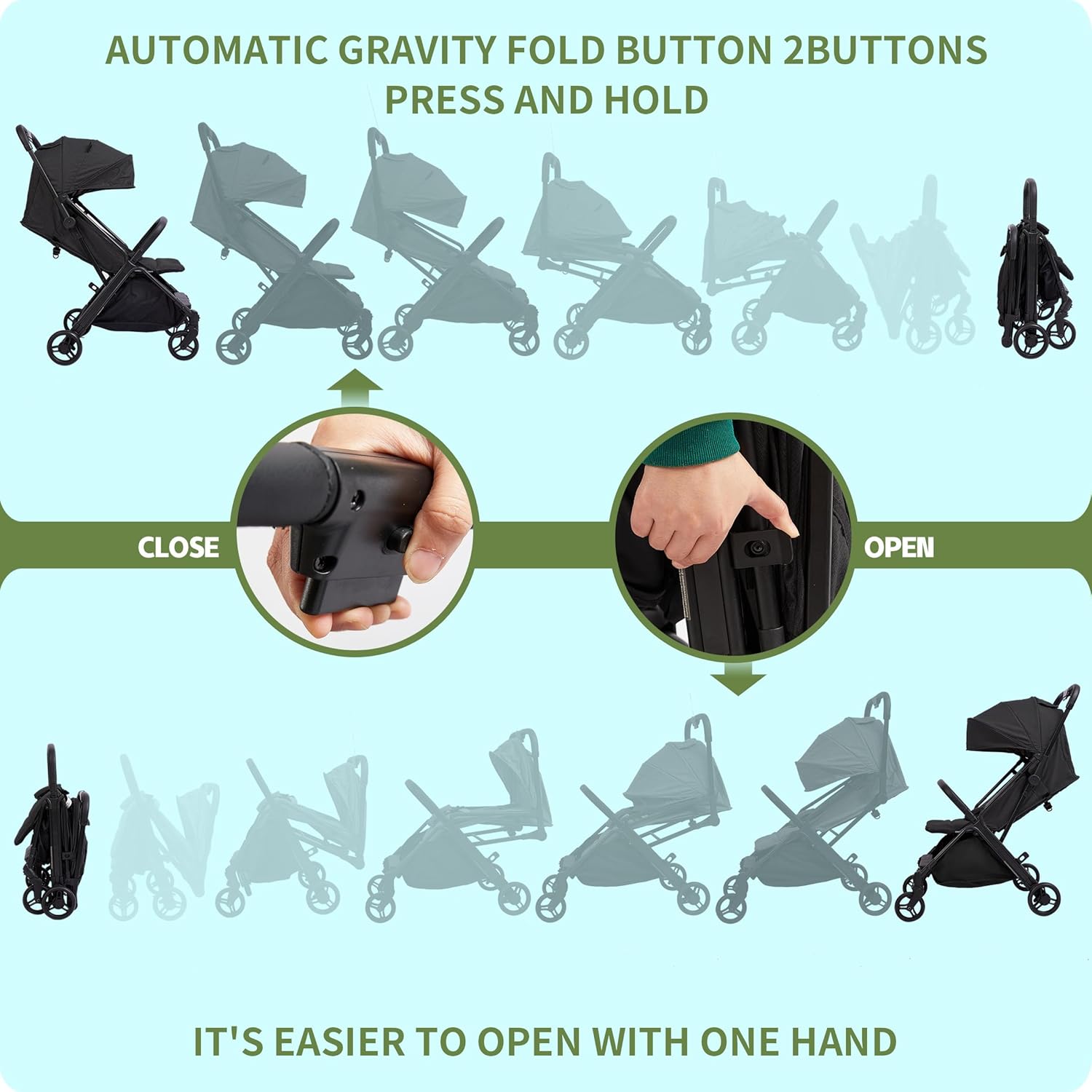 Portable Stroller:Foldable stroller lightweight travel Automatic Gravity folding in 3 Seconds,freeing your hands!Lightweight travel stroller have automatic lock hook allows the mother without bending down,making the trip more convenient!